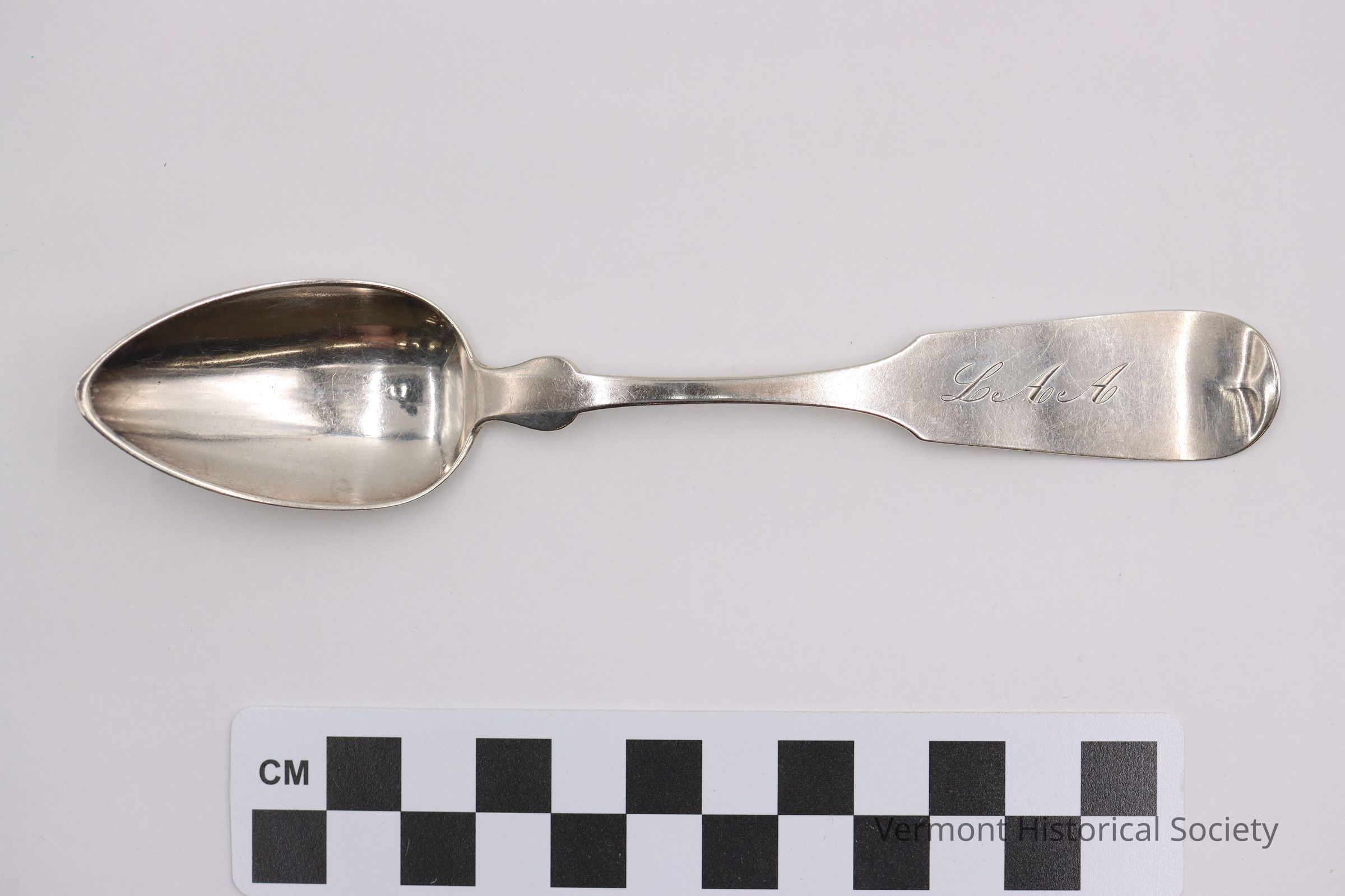 Silver teaspoon with pointed shoulder and upturned tipped fiddle handle. The handle is engraved with the initials "L.A.A." The back of the handle is marked, "B.M.BAILEY."