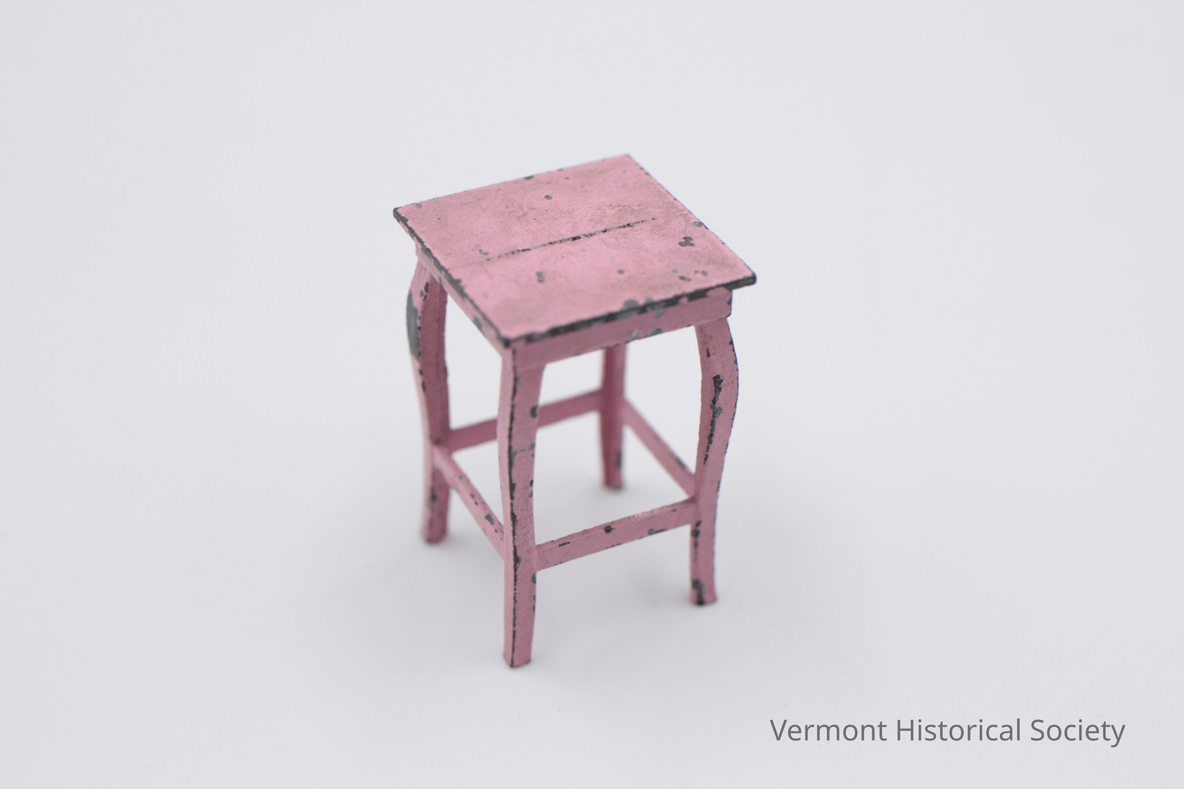 Miniature side table sized for a dollhouse. The table is made from cast iron and painted it. It has a square table top and four curved legs connected by stretchers.Context