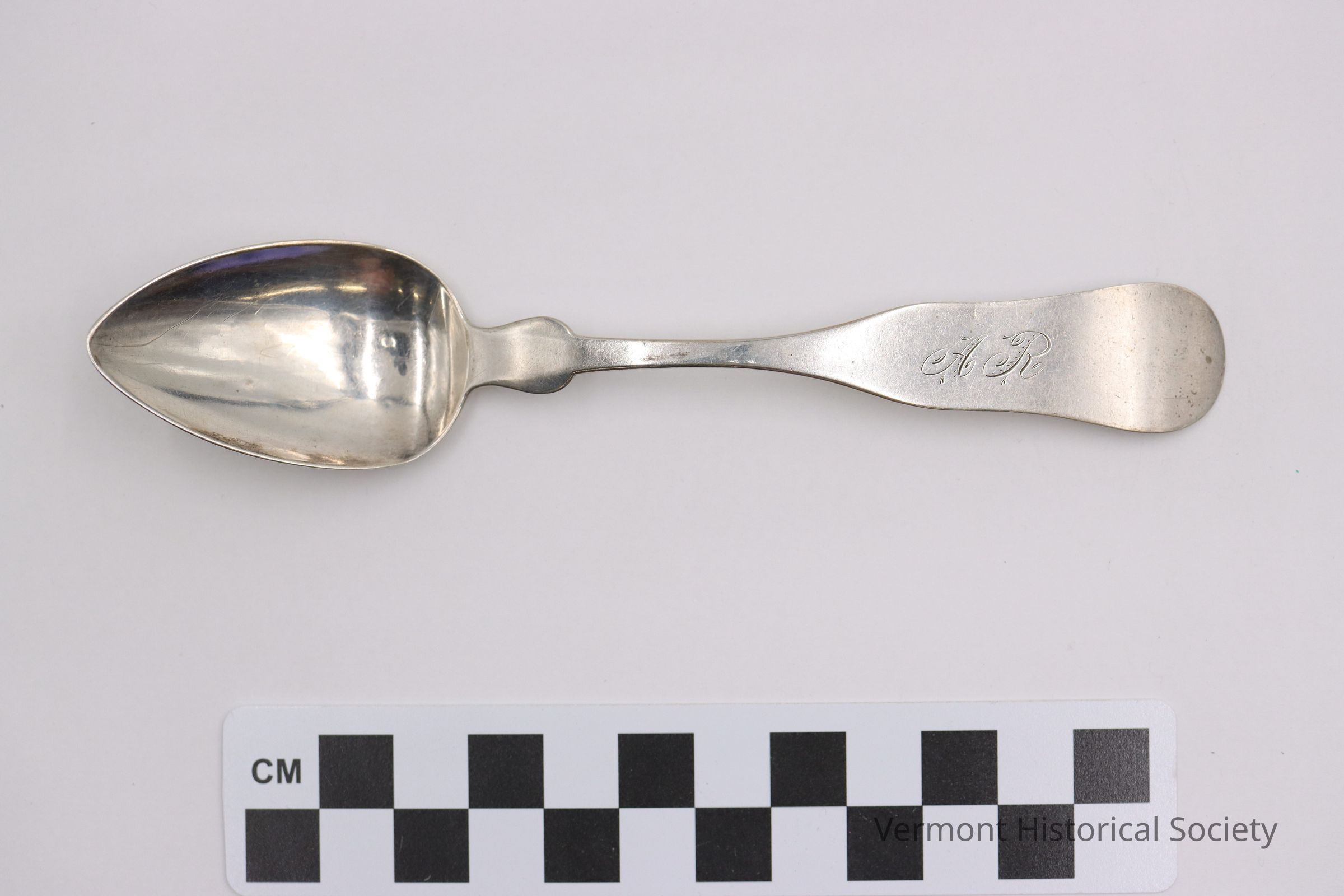 Silver teaspoon with round shoulder and downturned fiddle handle. The handle is engraved with the initials "A.R." The back of the handle is marked, "R. H. BAILEY."