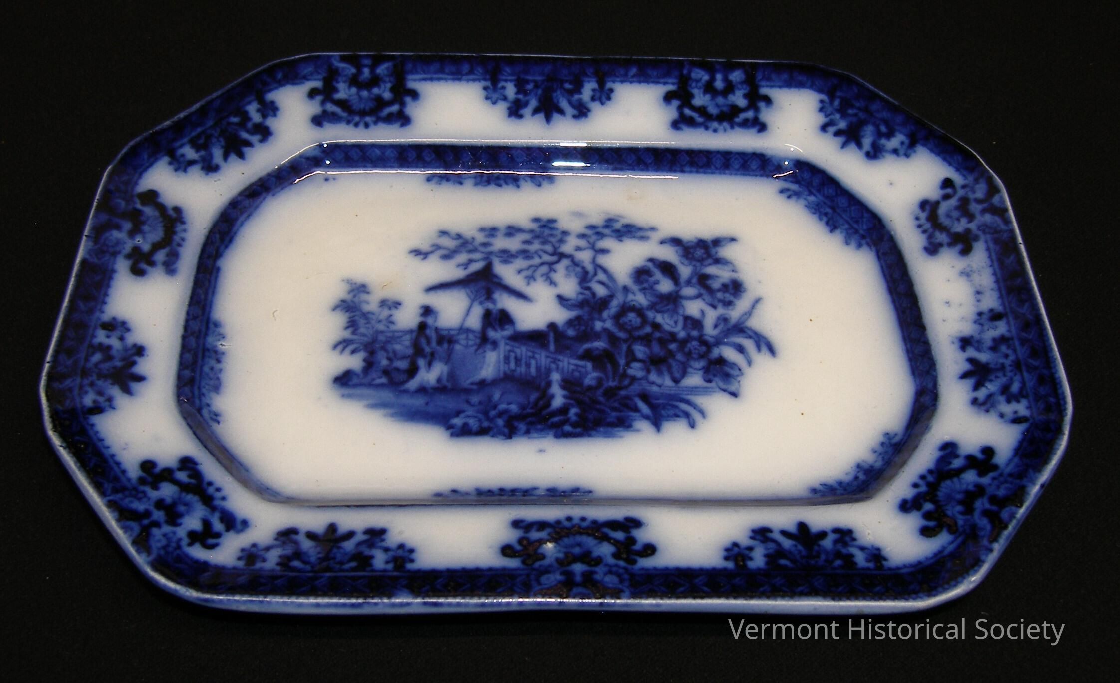 Small, rectangular tray transfer printed with an Asiatic scene. The central scene shows two female figures near a fence, one holding an umbrella over the others. The right side of the scene is dominated by an oversized floral bush. The border is printed with flowers.