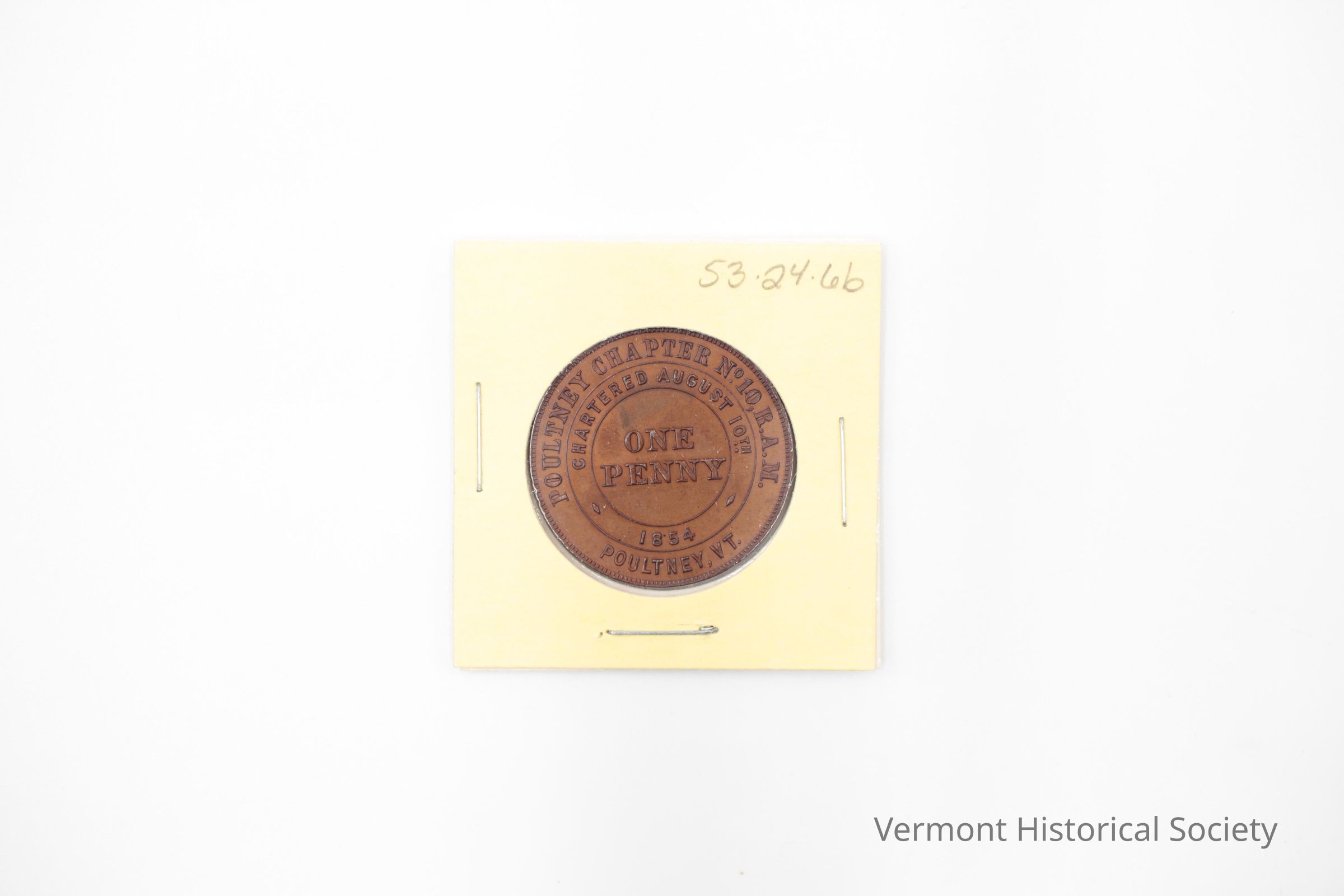 Copper coin with masonic imagery on one side and an inscription on the other. One side has a wedge (possibly representing a fez hat) with circle on the inside bearing the inscription, "H T W S S T K S". Flanking the shape are a chisel and a hammer. The other side has the inscription "ONE PENNY" in the center, "POULTNEY CHAPTER NO. 10 R. A. M. / POULTNEY, VT." around the outer edge, and "CHARTERED AUGUST 10TH 1854" inside of the first.Use