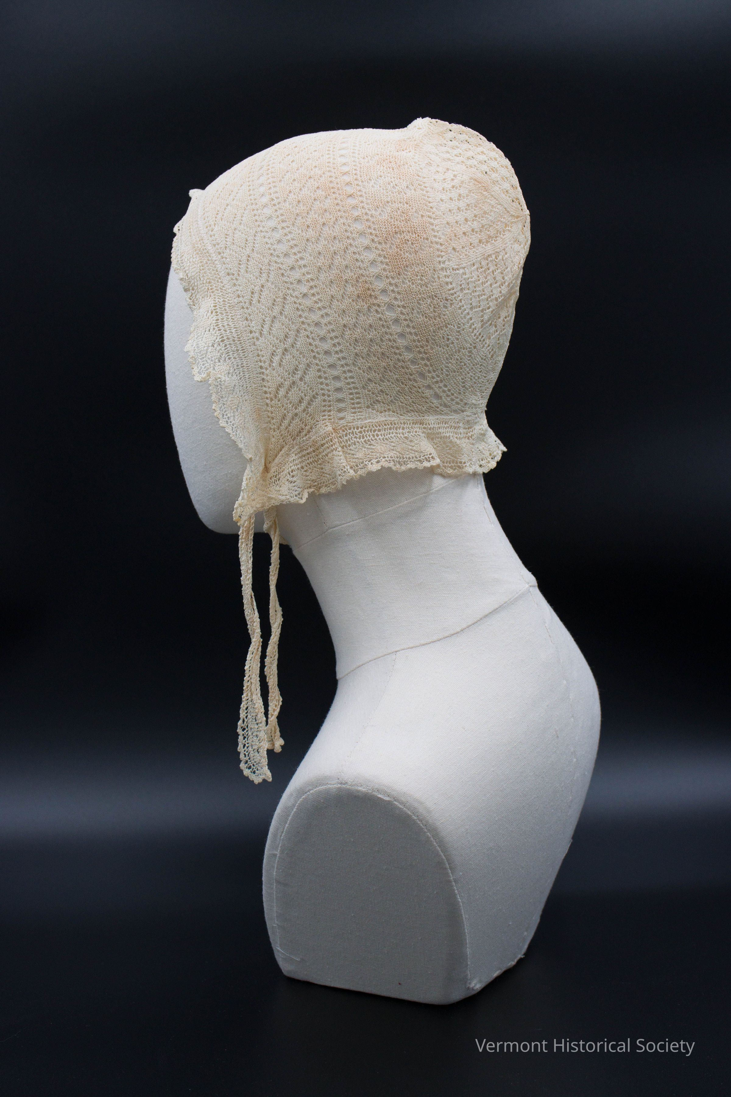 White cotton knitted lace cap. The cap is knitted in bands of decorative openwork with various repeating diamond patterns. The back of the cap is knitted in wedges. The edges are trimmed with crocheted lace, and crocheted lace ties are attached to each corner of the brim. The ties are asymmetrical in length, indicating that they would tie to one side of the wearer's face.Context