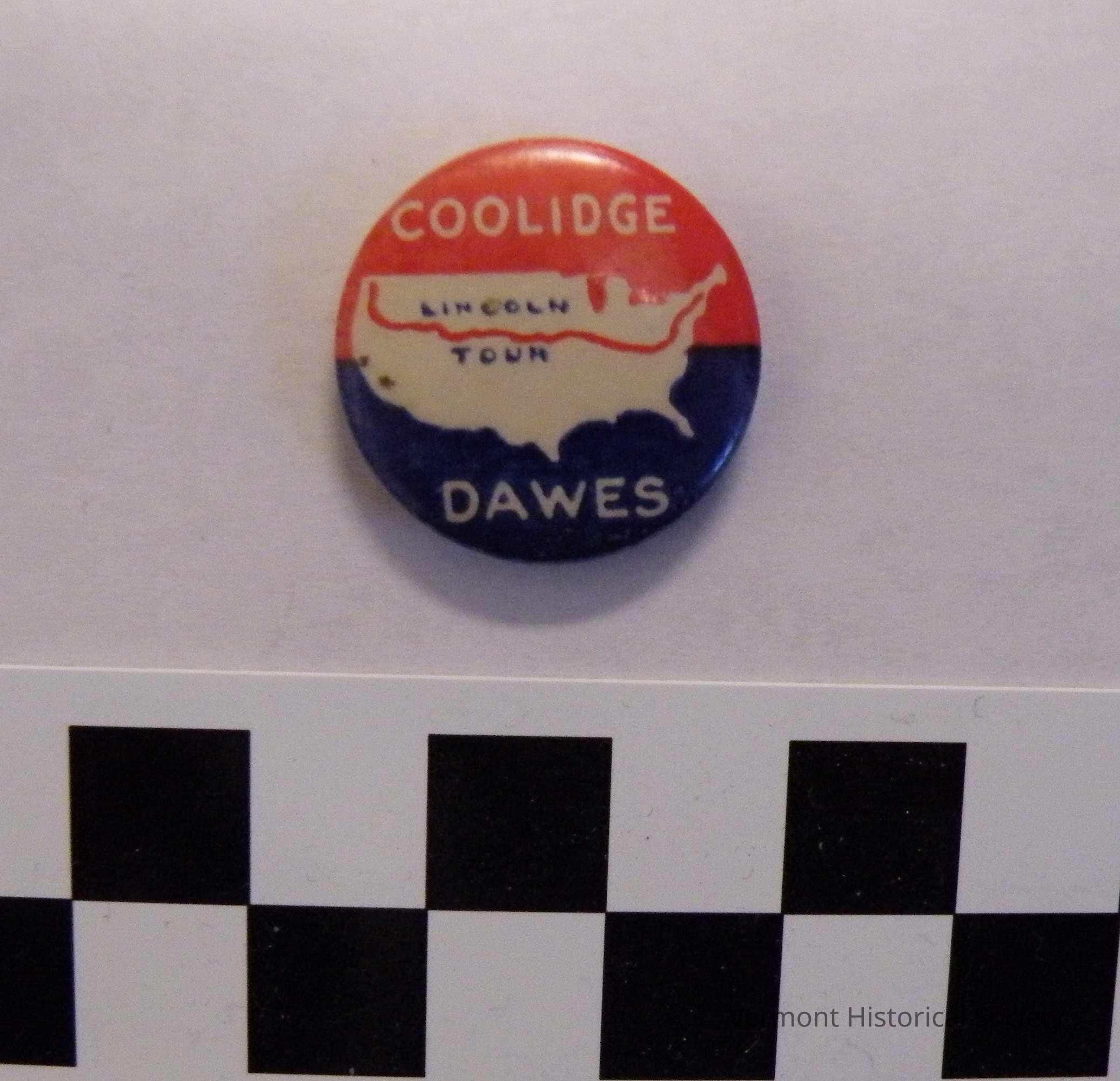 Round button printed red on the top and blue on the bottom with a white map of the contiguous United States. A red line is across the map, labeled with the words, "LINCOLN TOUR". Flanking the map at top and bottom are the words, "COOLIDGE / DAWES".