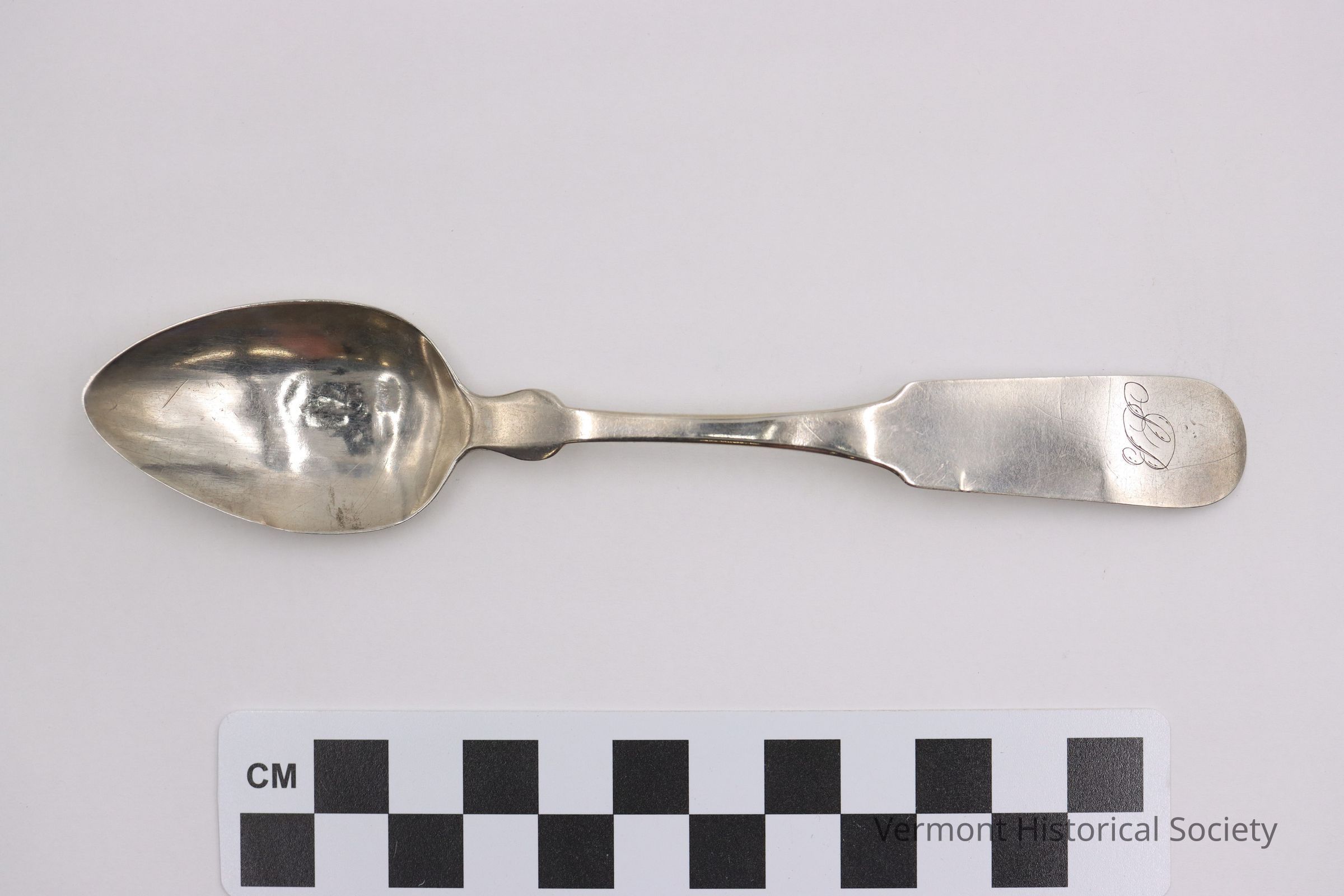 Silver teaspoon with rounded shoulder and downturned fiddle handle. The handle is engraved with the initials "SB" The back of the handle is marked, "Birge, Brackett & Co".