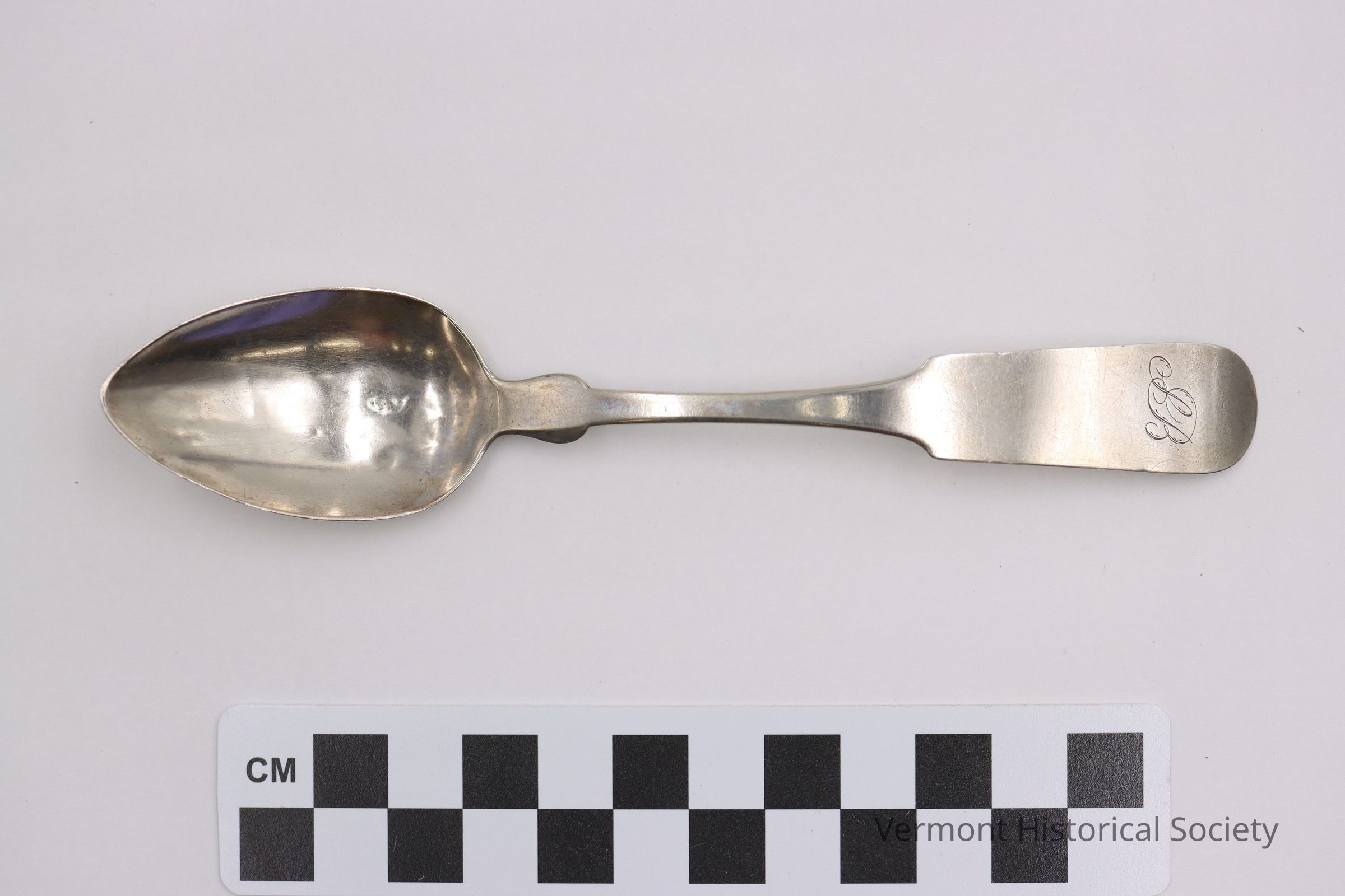 Silver teaspoon with rounded shoulder and downturned fiddle handle. The handle is engraved with the initials "SB" The back of the handle is marked, "Birge, Brackett & Co".