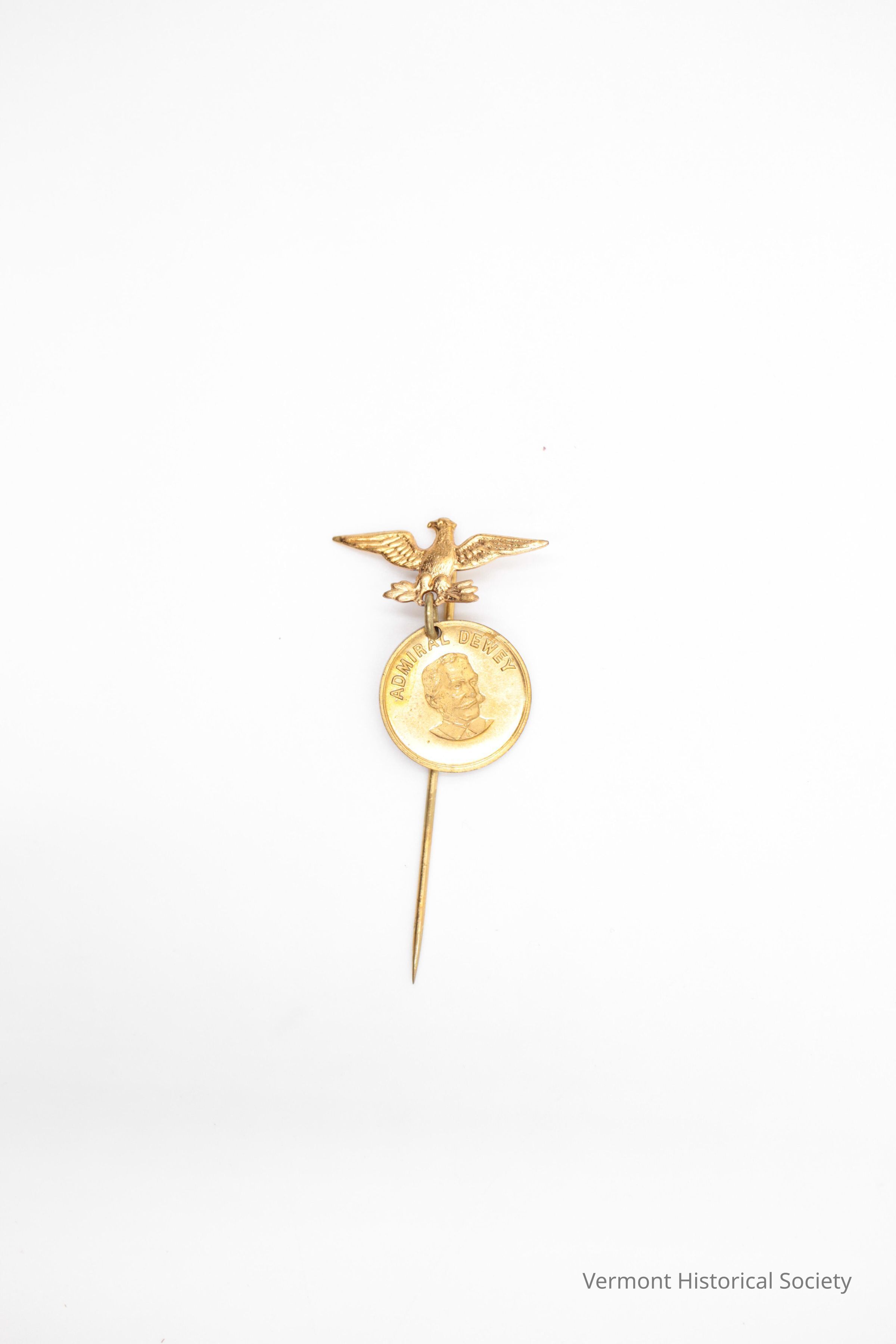 Gold stickpin topped with a spread eagle and with a small round medallion. The front of the medallion is molded with a bust of Admiral Dewey with the label, "ADMIRAL DEWEY". The back of the medallion shows a warship with the label, "FLAG SHIP OLYMPIA".Context
