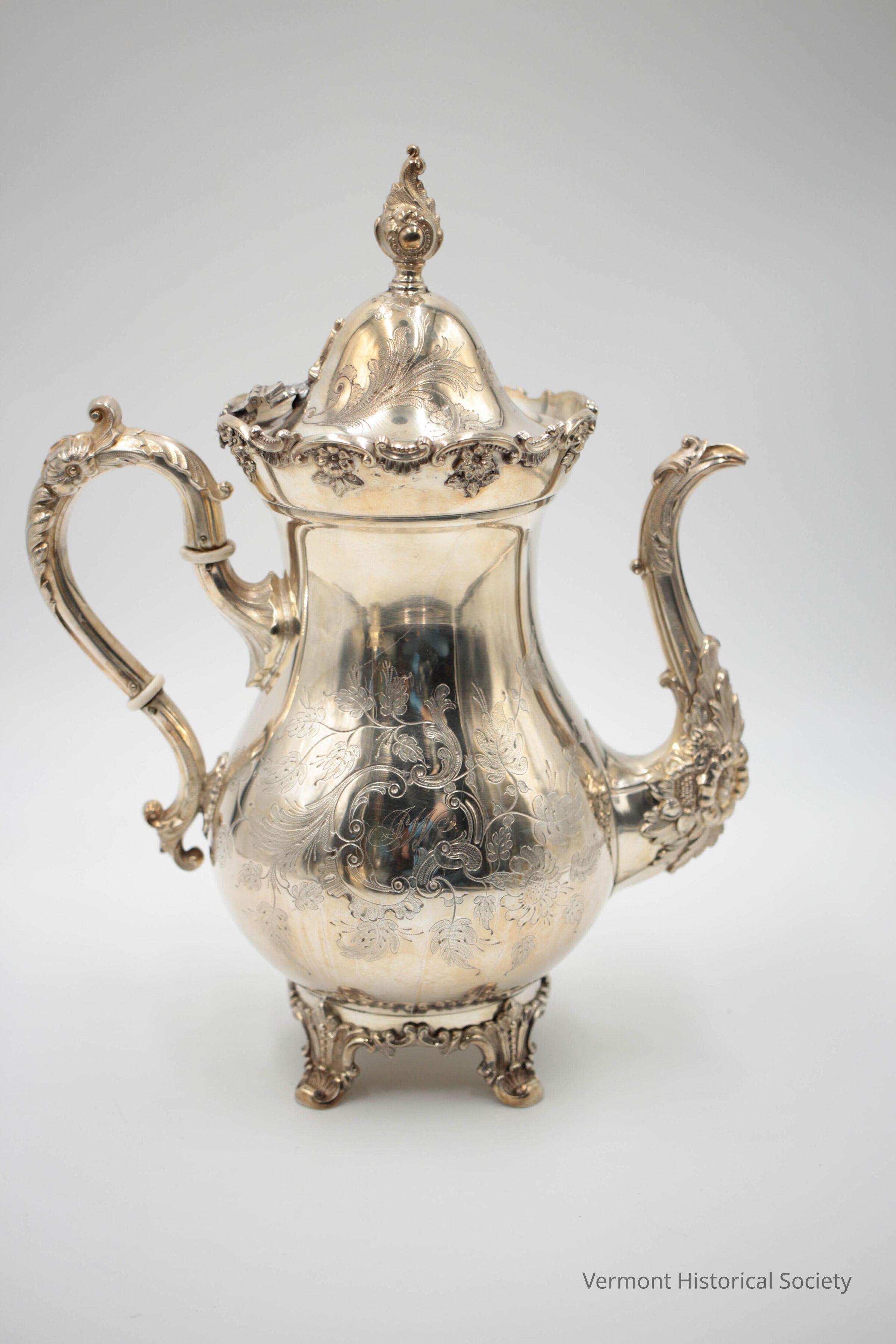 Ornate, silver teapot with hinged lid. The pot is extensively decorated with applied molded flowers at the base, handle, spout, and rim. The body and lid are engraved with rococo-style scrollwork featuring oak leaves on the front and flowers on the back. A cartouche at the center front is engraved with the initials, "JW".