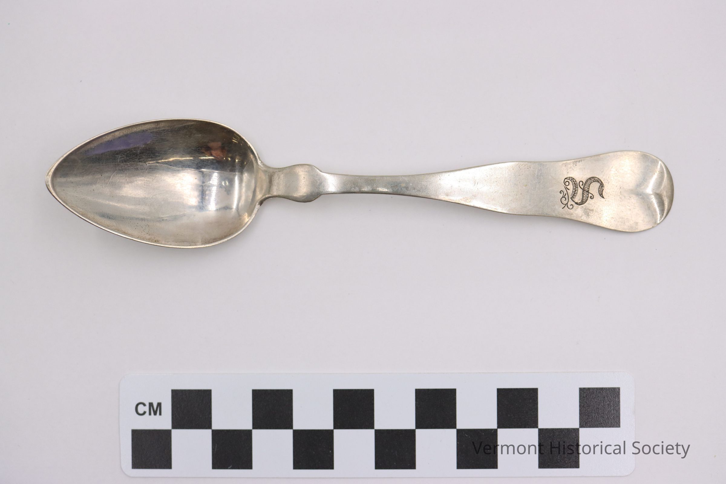 Silver teaspoon with rounded shoulder. The handle is engraved with the letter S in gothic script. The back of the handle is marked, "A. A. MEAD".