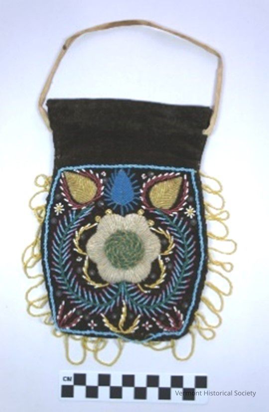 This pouch exhibits three of the most diagnostic bead-work style motifs, very similar to two moccasin fragments with a Waterville, Vermont provenance.Acquisition