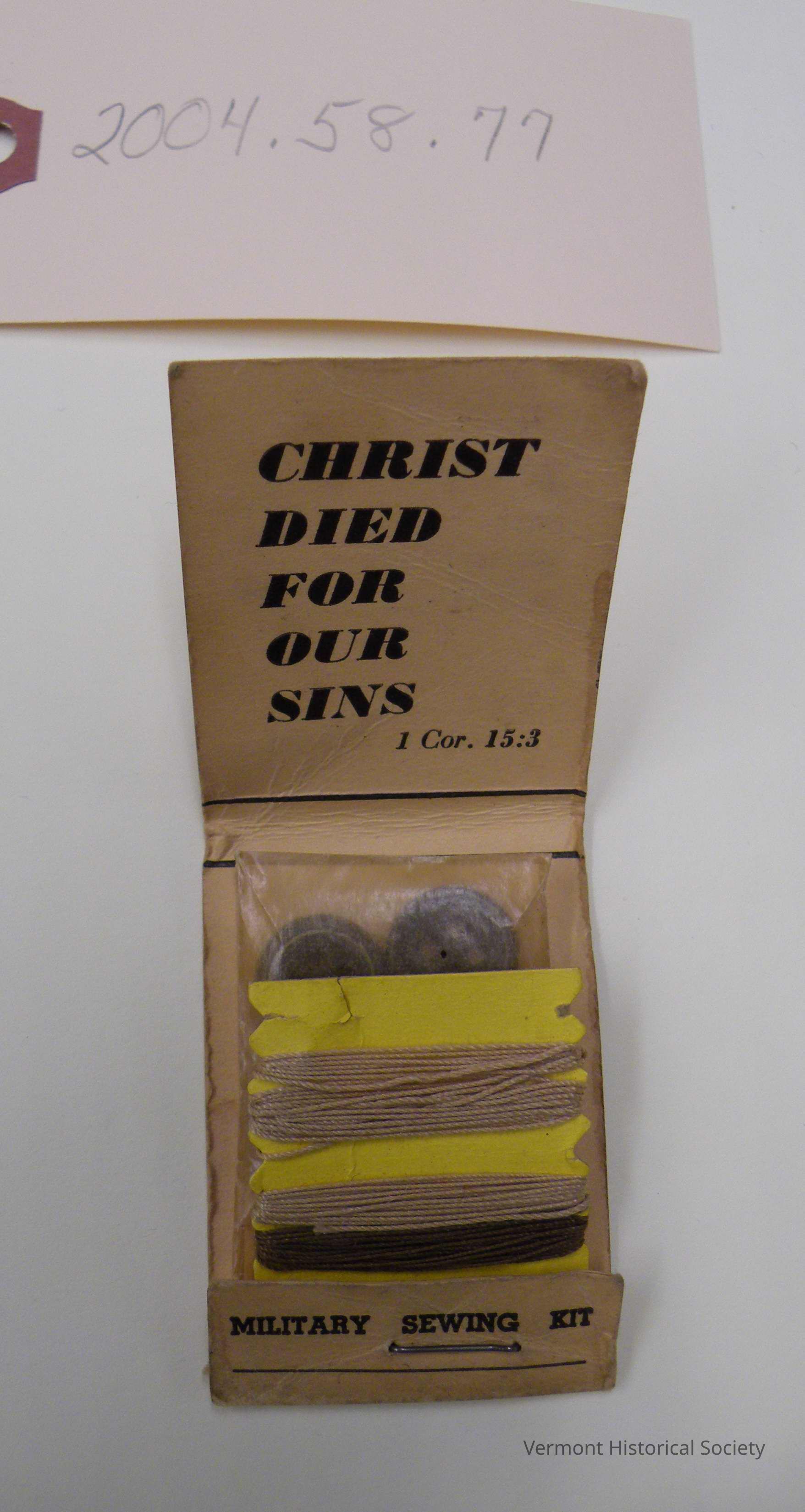 Cardstock, matchbook style sewing kit. The front flap of the kit is printed with the words, ""God Be With You 'Till We Meet Again" / Monrning Cheer Victory Center FOR SERVICE MEN 1511 Walnut St. Philadelphia, Pa." The back is printed with the words, "MORNING CHER VICTORY CENTER A Home Away from Home Dormitories Showers . . . Lounges Coffee Room Recreation Writing Room Infomation on: WHERE TO GO WHAT TO DO In Philadelphia A Welcome - - Always". The kit contains a yellow cardboard bobbin wound with thread in varying shades of olive and khaki, and a plastic pouch of olive green plastic buttons. The cardstock case interior is printed with the words, "CHRIST DIED FOR OUR SINS / MILITARY SEWING KIT".Acquisition