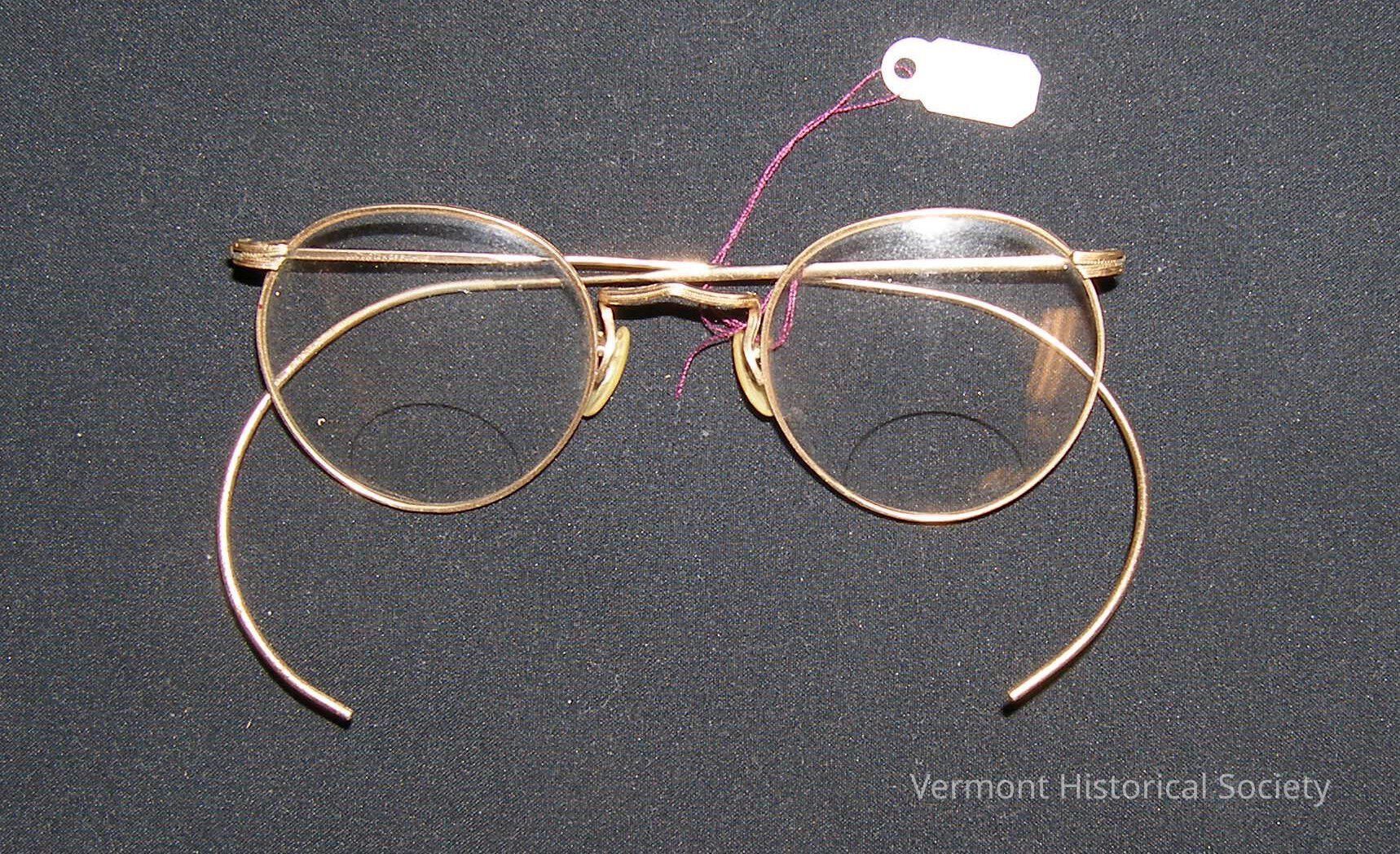 Metal framed eyeglasses with large, round clear glass lenses. There is an oval at the bottom center of each lens with a higher magnification lens inserted. The ends of the temples curl downward to wrap around the wearer's ears.