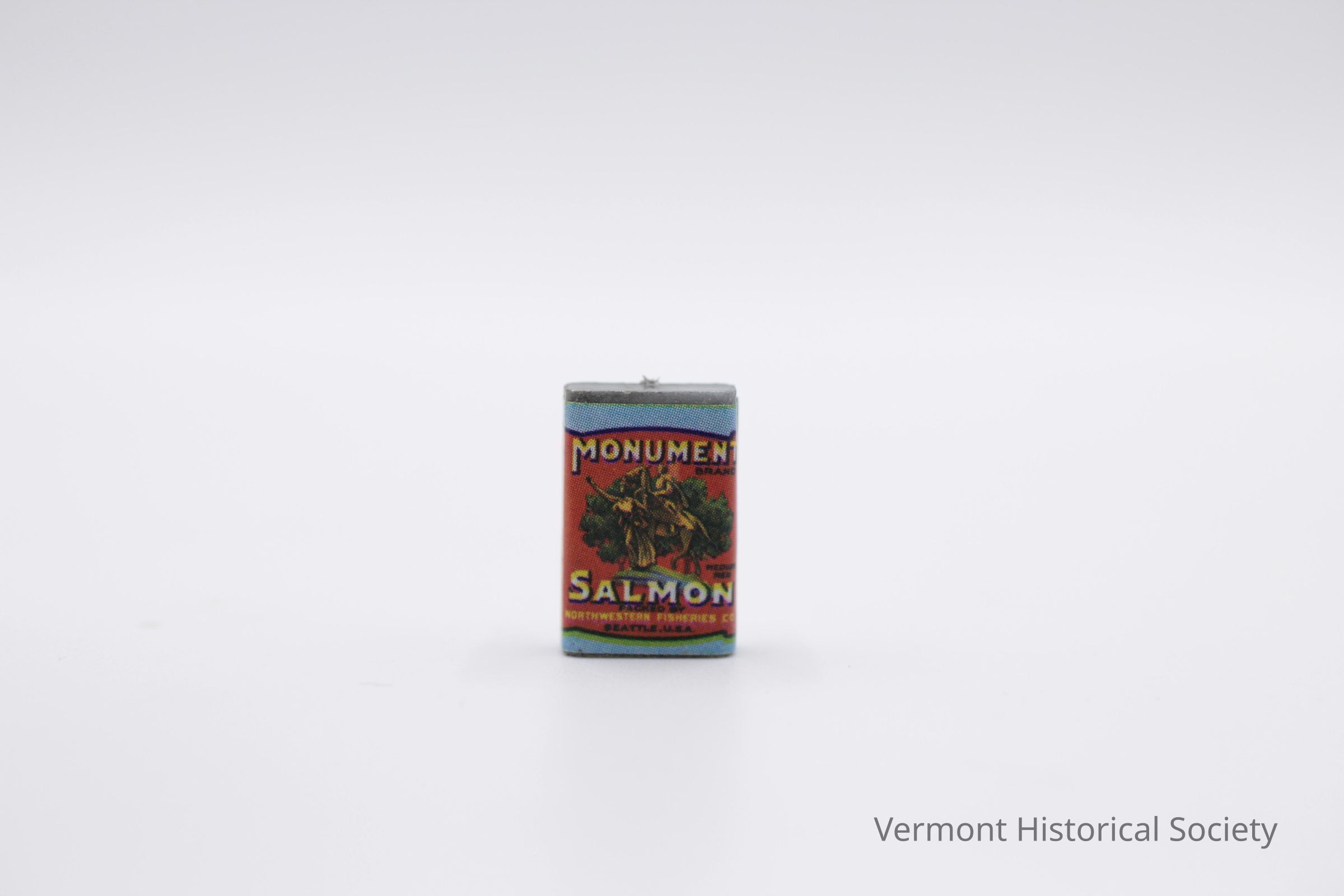 Miniature rectangular food-storage can. The can is made of silver-colored plastic wrapped with a paper label. One side of the label shows a military monument and the words, "MONUMENT SALMON." The other side shows a fish and the words, "MONUMENT SALMON".Context