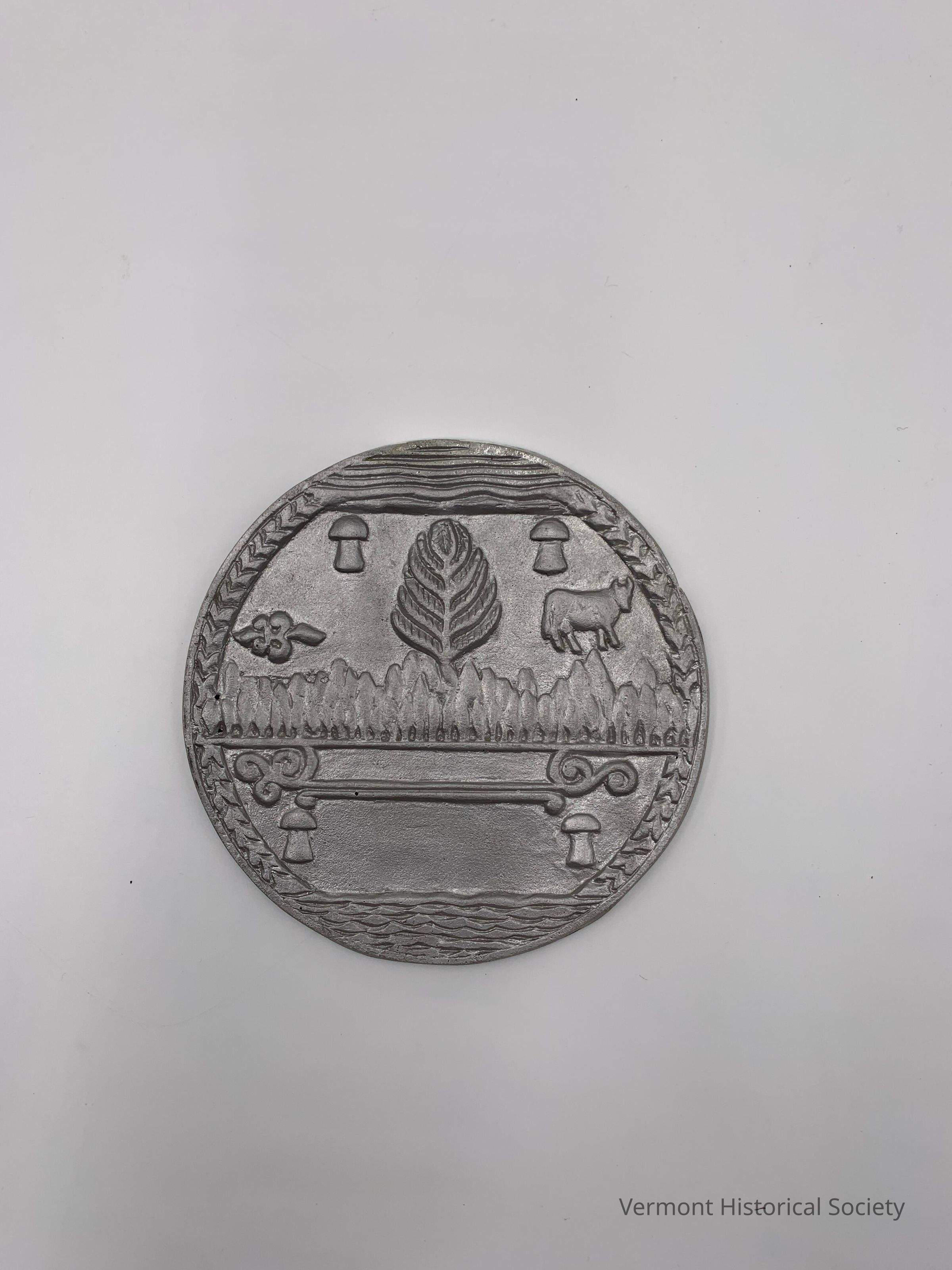 One-sided plaster cast of the Vermont state seal. The seal has a tree in the center, a cow to the left, and two sheaves of wheat (that look more like mushrooms) flanking the tree. The lower half is molded with the state motto, which reads, "VERMONT / FREEDOM & UNITY". The plaster is painted silver.Acquisition