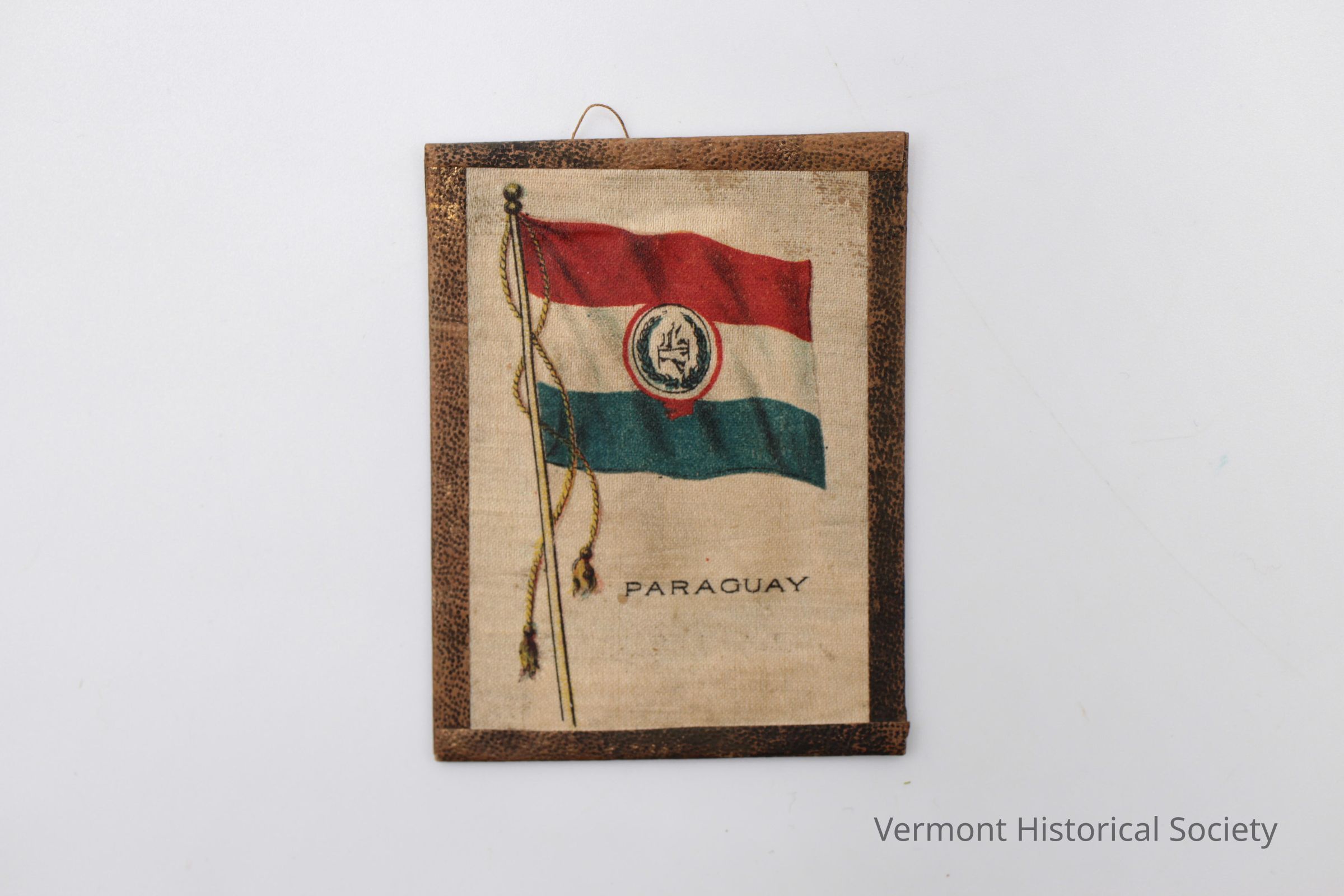 Miniature wall hanging sized for a dollhouse. The piece consists of a small print showing a waving Paraguayan flag (red on top, white across center, blue on bottom, seal at center) on cardboard. The edges are bound with textured, metallic tape. There is a loop of gold thread at the top for hanging.Context
