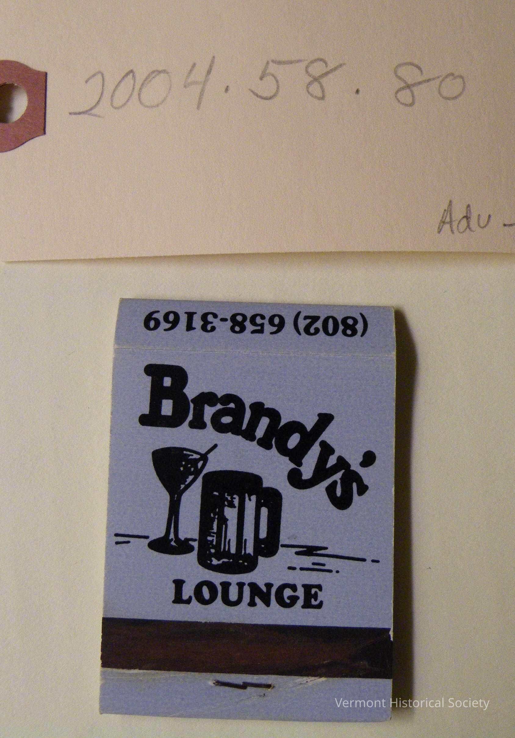 Matchbook. The cover of the matchbook is made of light blue cardstock and features black lettering that reads "BRICK OVEN Restaurant, A Nice Place to Eat, 1653 Williston Rd., So. Burlington, VT." On the back cover, the matchbook reads "BRANDY'S LOUNGE." The telephone number is located on the thick end and is printed as "(802) 658-3169". On the thin end of the matchbook, it reads "McAuliffe Dist., Burlington, VT SM."