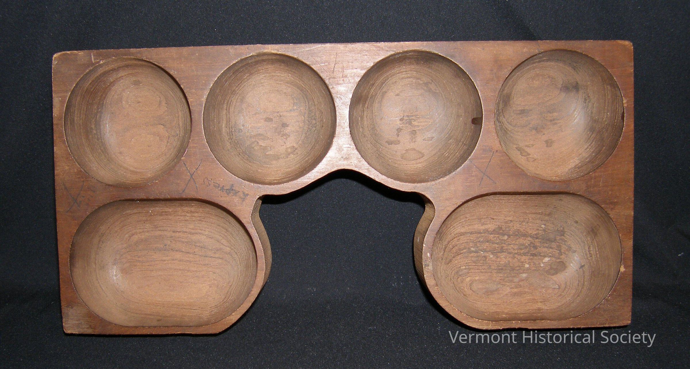 Wooden tray with four round divots, or bowls, along the straight edge and two oval-shaped divots, or bowls, at either side of the front. There are three Xs written on the surface with ink. One bowl is marked "Express".Context