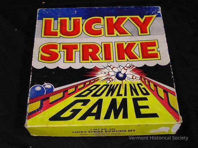 Boxed toy bowling game. The game consists of 10 wooden bowling pins with red heads, and a red wooden ball. The pins and ball fit into shaped cutouts within a cardboard inset in the cardboard box. The lid of the box is printed with an illustration of a bowling alley with a ball striking 5 pins and the inscription, "LUCKY STRIKE BOWLING GAME".Context