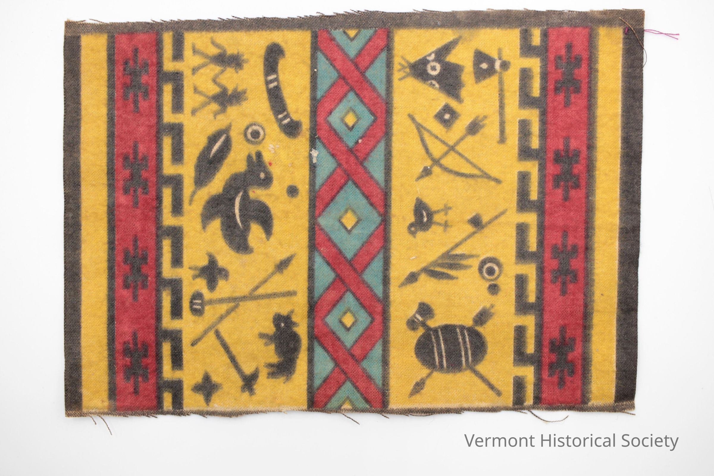 Miniature rug sized for a dollhouse made from a piece of printed flannel. The print is in stripes, alternating between wide yellow stripes and patterned red stripes. The yellow stripes are printed with indigenous American iconography, such as a teepee, a canoe, spears, shields, and tomahawks.Context