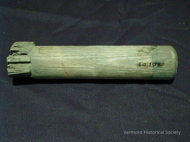 Cylindrical wooden peg. One side has been pounded open, splitting along the grain.
