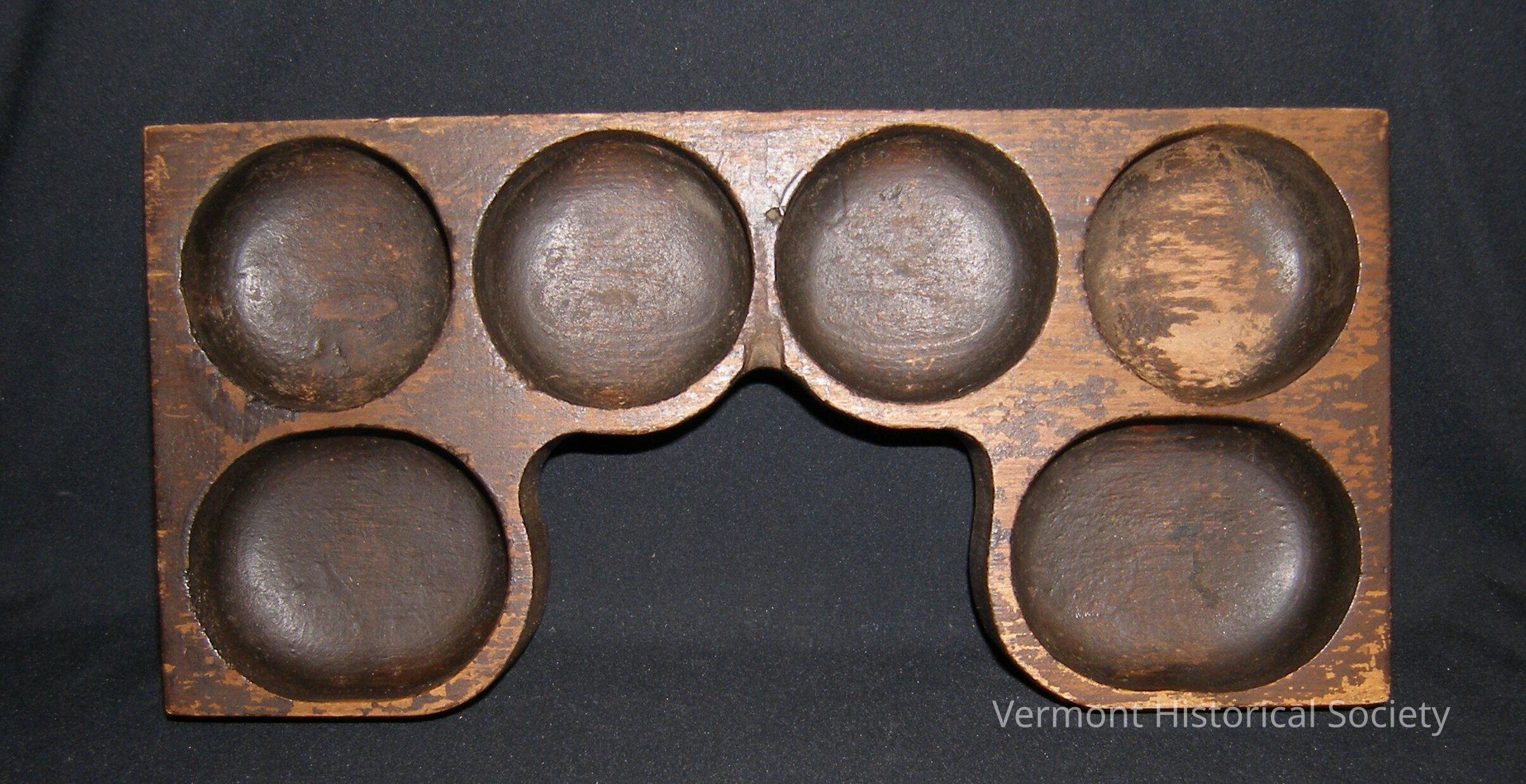 Wooden tray with four round divots, or bowls, along the straight edge and two oval-shaped divots, or bowls, at either side of the front. The wood has been painted a darker shade of brown.Context