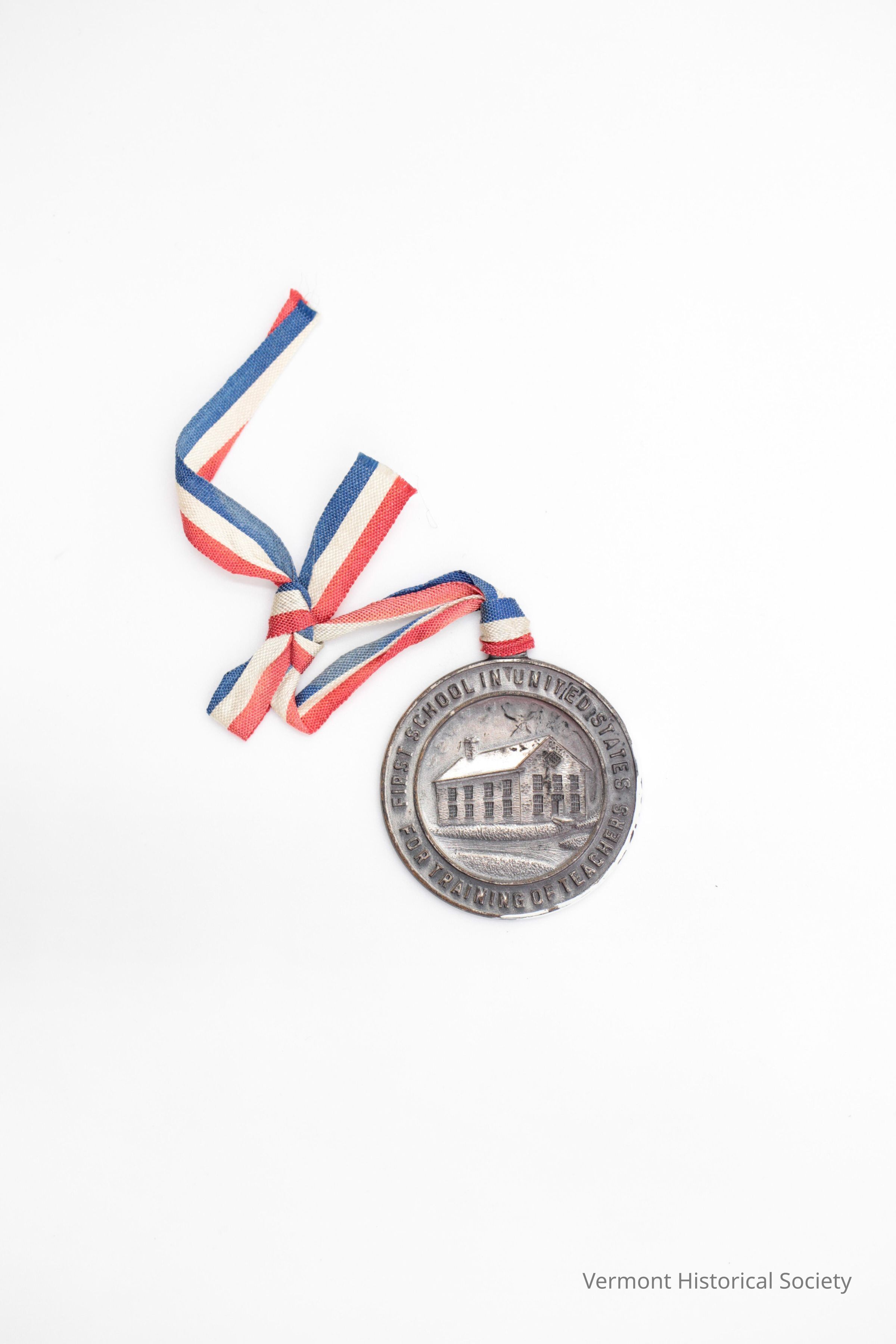 Small commemorative medal medal with a red, white, and blue striped ribbon tied to the top. One side of the medal is cast with an image of a two-story building with the inscription, "FIRST SCHOOL IN THE UNITED STATES / FOR TRAINING OF TEACHERS". The other side is cast with a tall torch in a laurel wreath between the dates 1823 and 1923. At the center is the inscription, "100th ANNIVERSARY, OF THE FOUNDING OF THE FIRST NORMAL SCHOOL IN AMERICA CONCORD, VERMONT".Context