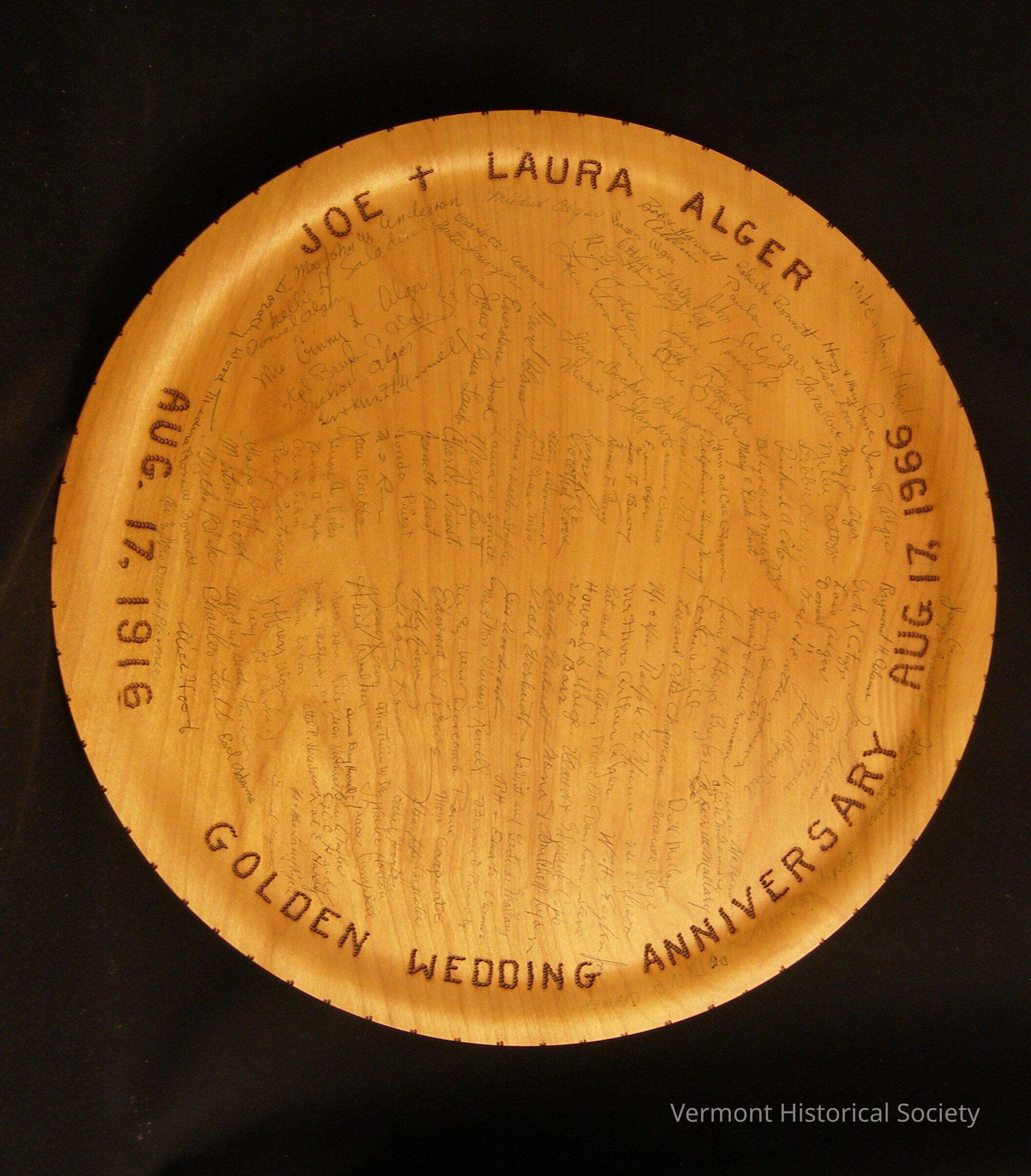 Round wood tray burned around the edge with the inscription, "JOE + LAURA ALGER / AUG. 17, 1916 / GOLDEN WEDDING ANNIVERSARY / AUG 17, 1966". There are handwritten names covering the middle of the tray. The back is burned, "Friendship Tray" and inked, "ABCDE&F".Context