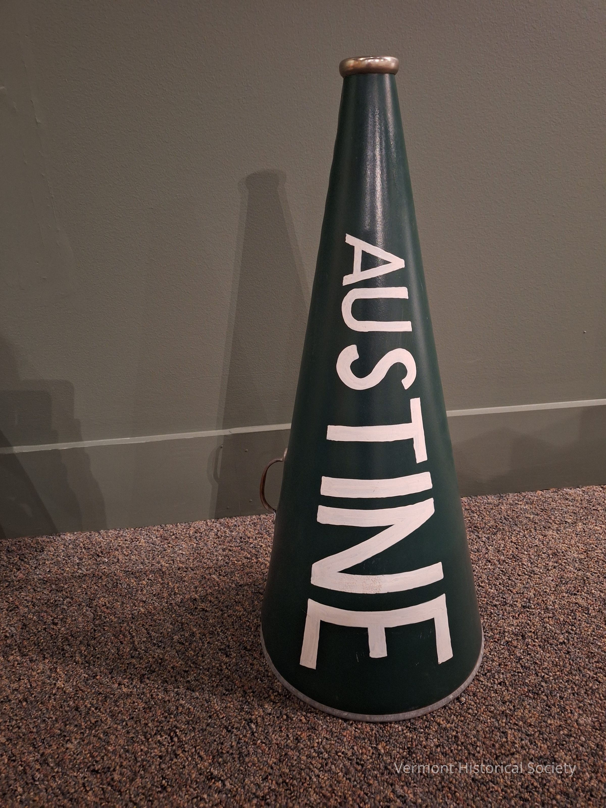 Green and white megaphone from the Austine Cheer Squad. The green megaphone has silver metal rolled rims at the small mouth opening and the larger projection opening, and a cleat-style handle a long the metal pinned seam. The megaphone is green with "AUSTINE" down one side in white lettering and a white arrow with scraped-away green "A" at the top point edge for the Austine Arrows.Context