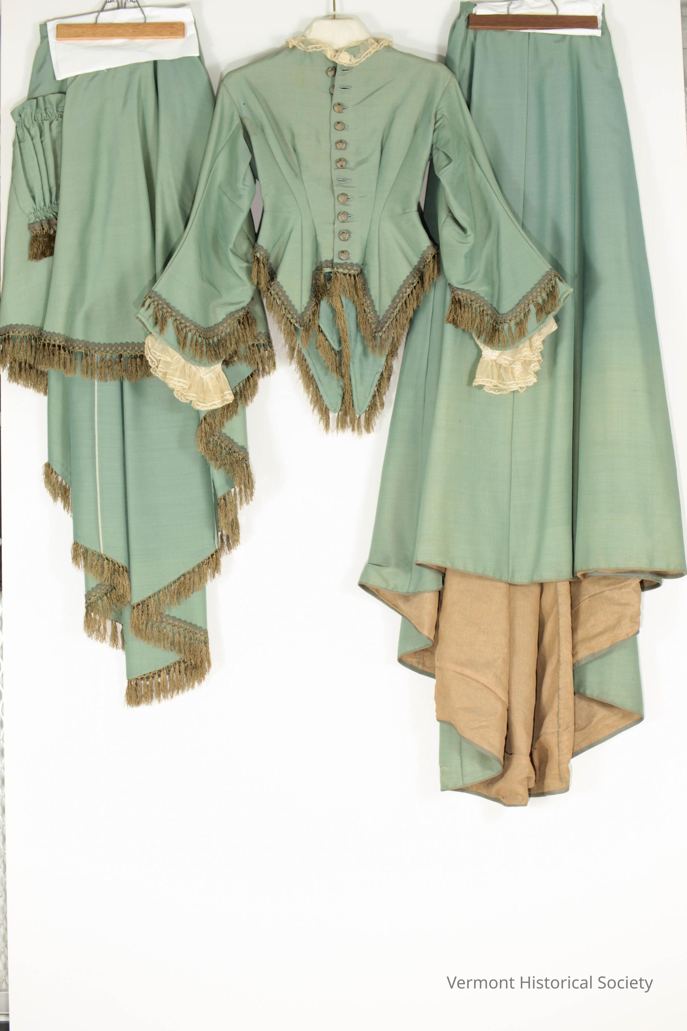 Three-piece aqua silk dress consisting of a bodice, skirt, and over skirt. The bodice extends below the wearer's waist, with the hem falling into two points at both the front and the back. It opens at the center front and secures with large buttons. The sleeves and hem are trimmed with fringe. The sleeves are made in two parts: a wide oversleeve and lace undersleeves. The skirt has a long train. The overskirt is trimmed in the same fringe as the bodice.