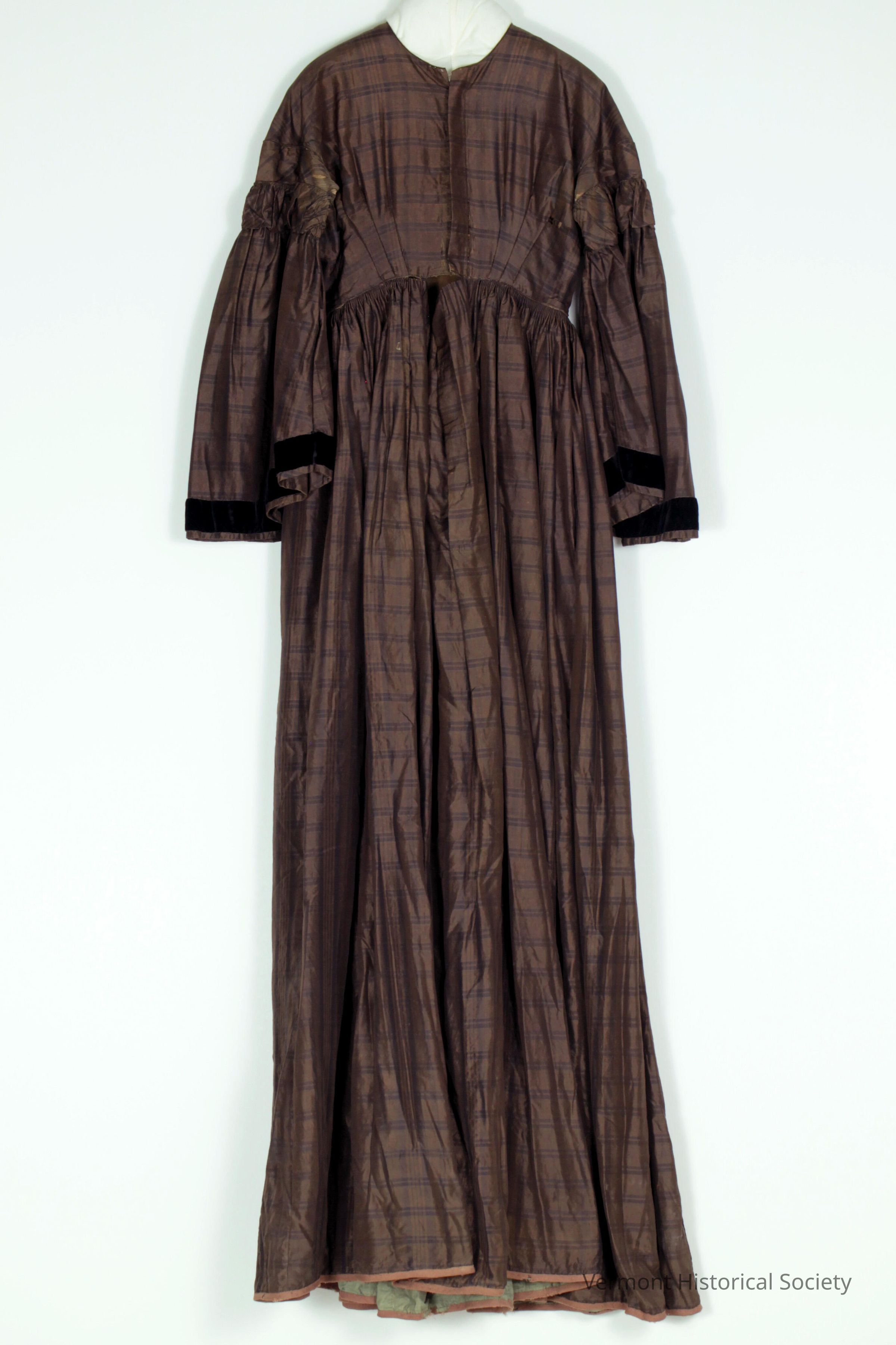 Woman's brown plaid silk dress with long sleeves, a round neckline, and a full gathered skirt. The bodice opens down the center front and secures with hooks and eyes. There is a separate placket extending half way down skirt front. The bodice has boned, vertical darts in. The sleeves are cut narrow at the top, with ruffled inserts just below the shoulders, and extending to a wide bell shape with wide velvet bands at the cuff. The skirt is very full and tightly gathered at the waist. It has a narrow, lighter-brown corded binding along the hemline and a seam pocket on right side. The bodice of dress is lined in brown cotton, and the sleeves and skirt are lined in green cotton.Context