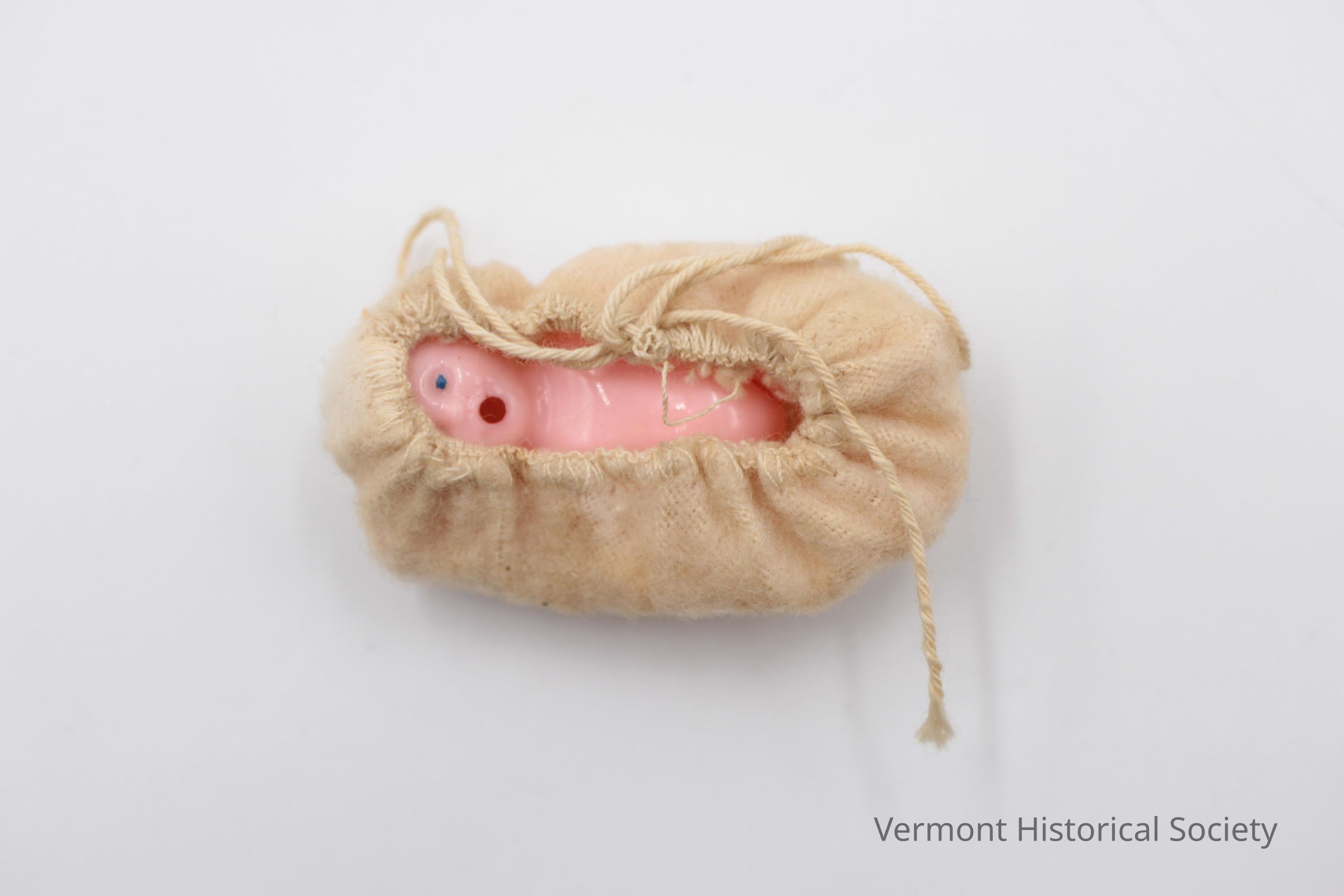 Miniature plastic human baby inside a cotton drawstring bag. The baby is hollow with a round, open mouth. The edge of the mouth is painted red, and the eyes are painted blue.Context