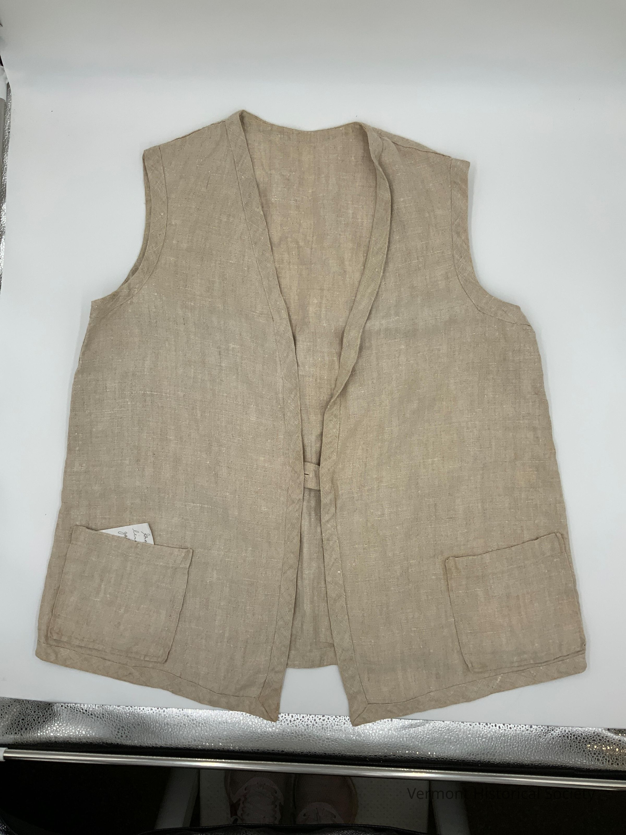 Linen golfing outfit consisting of a vest and knickers. The vest secures at the center front with an interior tab and has two patch pockets. The knickers are cut wide with a tight cuff that sits below the wearer's knees. The waist secures at either side with vertical rows of buttons.