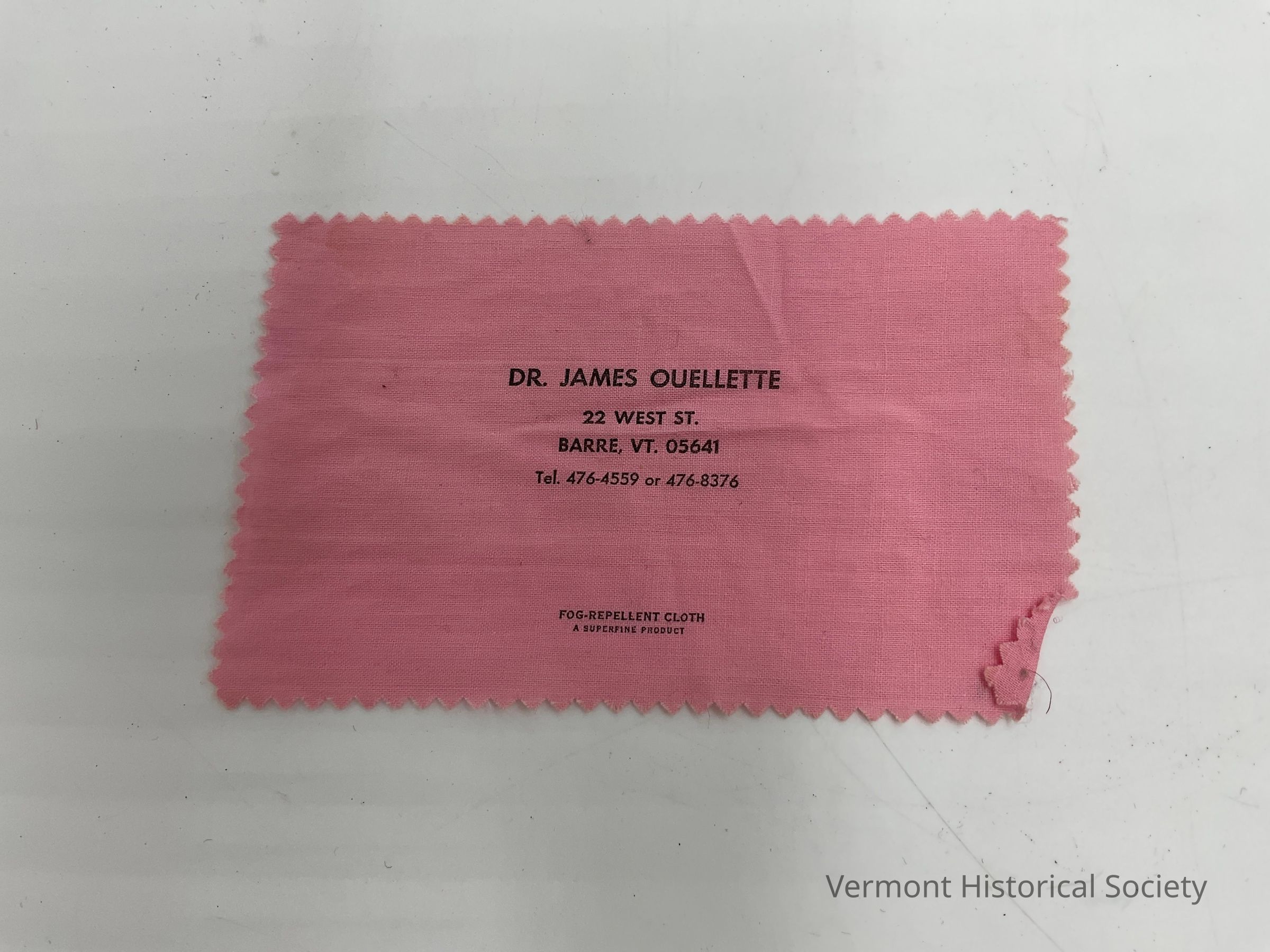 Pink cloth for wiping glasses with edges cut with pinking shears to prevent unraveling. In the center of the cloth, printed in black, is the following: Dr. James Ouellette, 22 West St., Barre, Vt. Tel. 476-4559 or 476-8376." At the bottom, "Fog-repellent cloth. A superfine product."Context