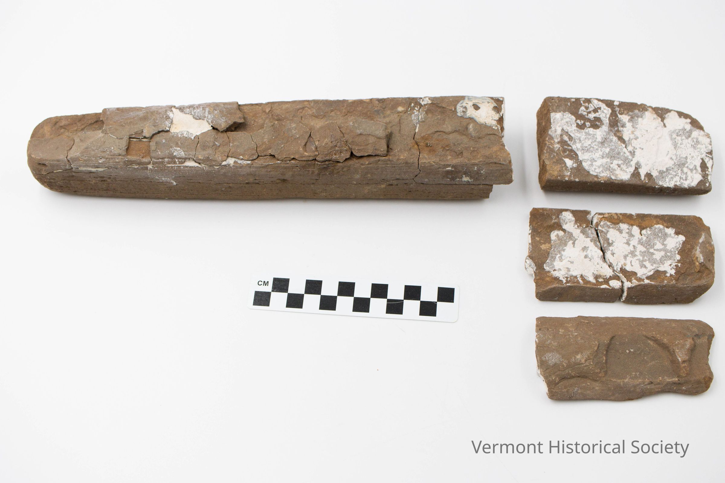 Long, rectangular naturally formed sandstone formation. It is broken into 4 pieces, all showing evidence of a previous plaster repair attempt.Context