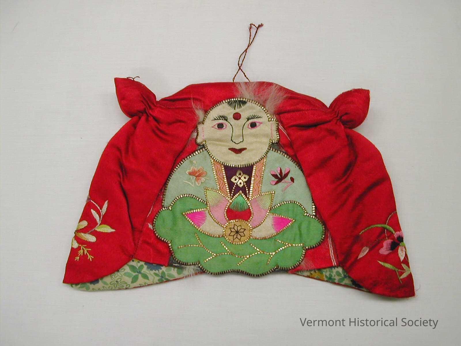 This red silk cap is adorned with a Buddha applique on the front. On each side of the cap, there is an embroidered flower. Additionally, the cap features stuffed animal ears that protrude from the crown. The interior of the cap is lined with a blue and green floral fabric. Lastly, there is a single-thread loop situated at the crown.Context