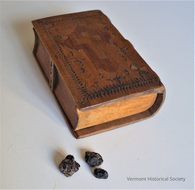 Wooden box carved in the form of a book. Inlay cross, stars, and pinwheels on the cover with chip-carved decoration surrounding. Three pieces of spruce gum [resin] contained in the box.Context
