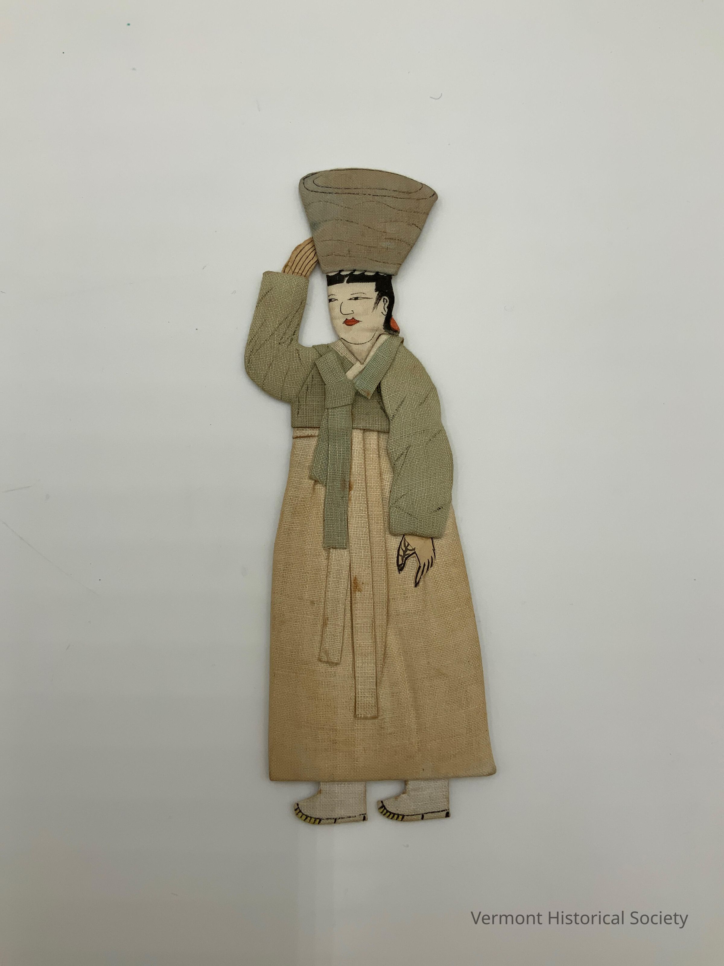 Padded, but mostly two-dimensional, doll. The doll is wearing a loosely fitted garment consisting of a long-sleeved blue jacket and a white skirt. She is holding a large basket on her head. The face and hair are drawn on with red and black ink, and details are added to the hands and feet with black ink.Context