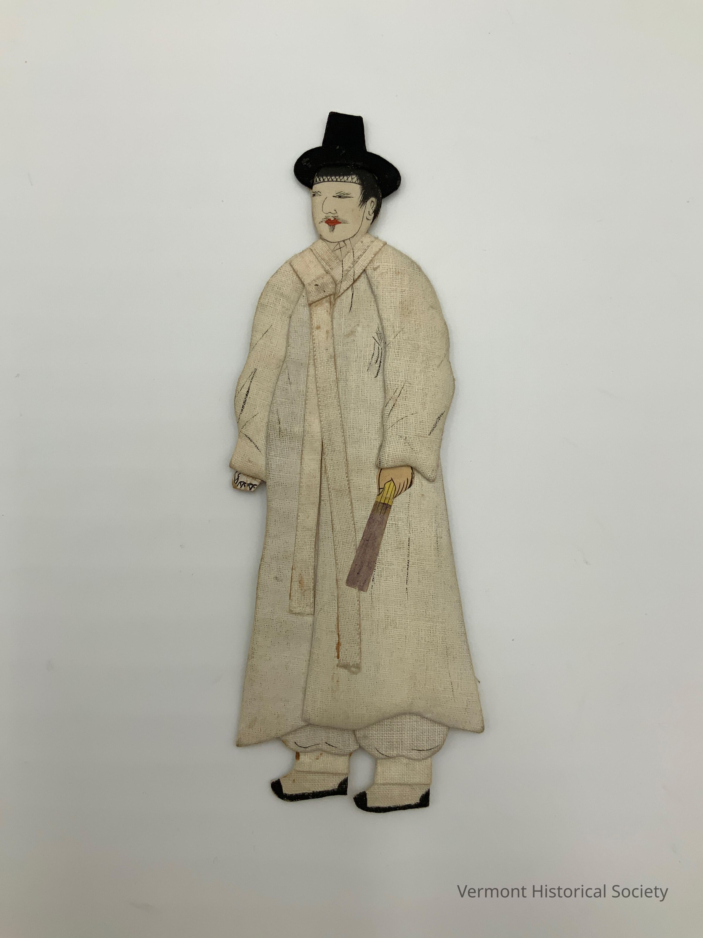 Padded, but mostly two-dimensional, doll. The doll is wearing a loosely fitted garment consisting of a long-sleeved white jacket and white pants that secure tightly at the ankle. He is holding a purple fan in his left hand. Both the hand and the fan are paper, while the other hand is cardboard. He is wearing a blak hat with a brim and a tall crown. The face and hair are drawn on with red and black ink, and details are added to the hands, shoes, and clothing with black ink.Context