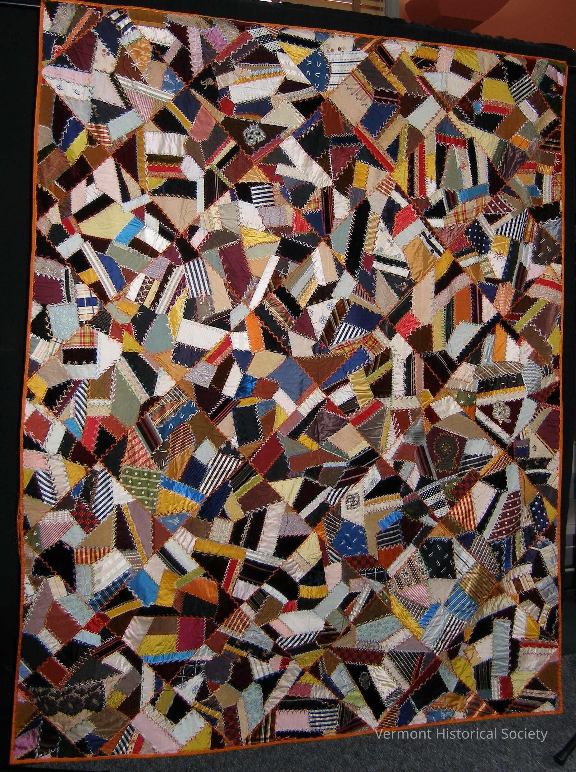 Crazy quilt constructed of several different types of silk, cotton, and wool. The quilt is made from square blocks set diagonally to the edge. The edges are bound with black velvet, and the back is lined with orange silk. It is tied rather than quilted. The seams are decorated with embroidery stitches including feather stitch and herringbone stitch.Context