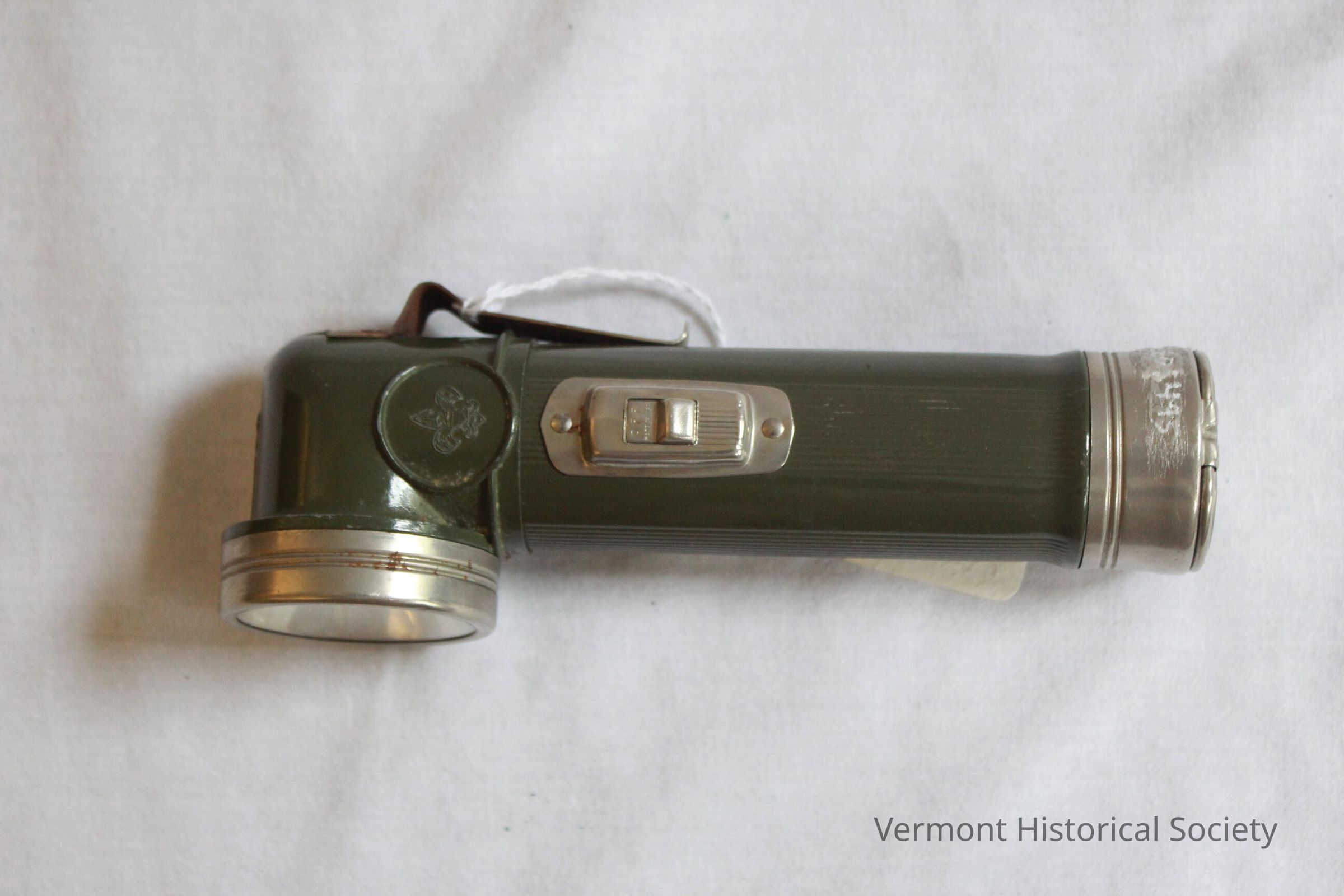 This flashlight is shaped like a periscope and is colored olive green, except for the rim around the flash area and the base and the clip. There are two raised circles on either side of the flashlight, surrounding the Boy Scout insignia. The base is engraved with the Boy Scouts of America fleur-de-lis insignia and the words "Official Flashlight Boy Scouts of America."Context
