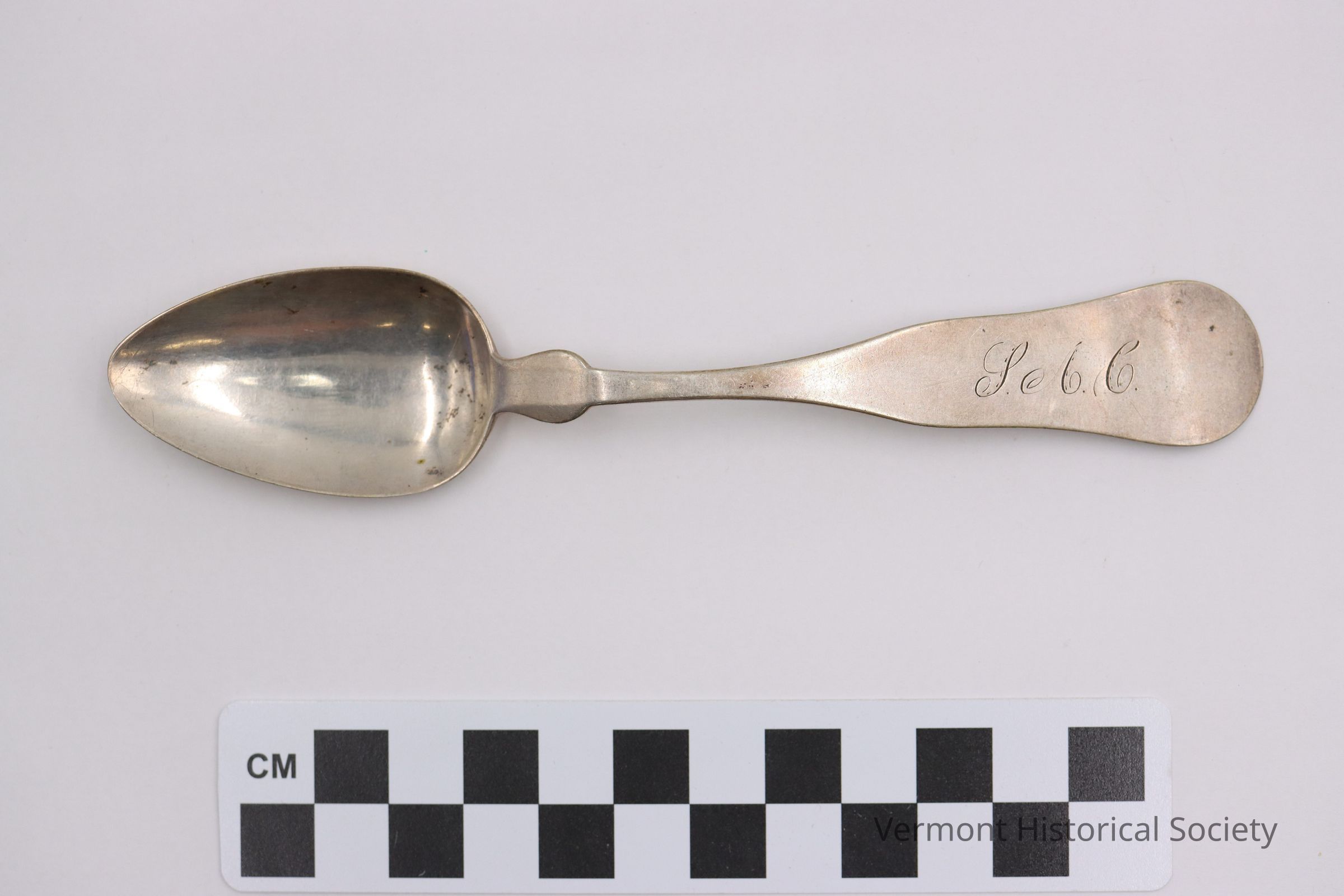 Silver teaspoon with a slightly pointed bowl and rounded shoulders. The handle is engraved with the initials "S.A.C." The reverse is marked "LUDLOW,VT." at the shoulder, and "B.M.BAILEY" on the handle.