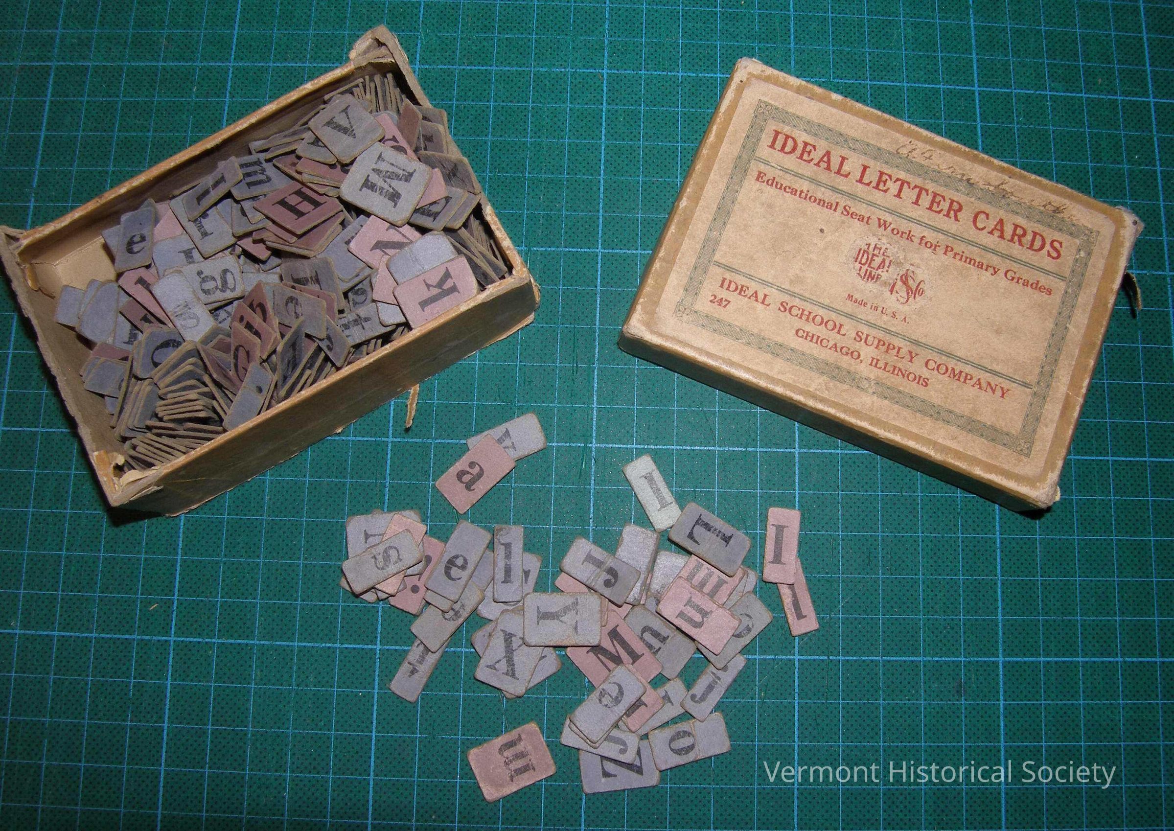 Cardboard box filled with cardstock rectangles printed with capital and lowercase letters. The cards are blue and pink. The label on the box reads, "IDEAL LETTER CARDS / Educational Seat Work for Primary Grades / The Ideal Line Co. / Made in U. S. A. / IDEAL SCHOOL SUPPLY COMPANY / Chicago, Illinois".Context
