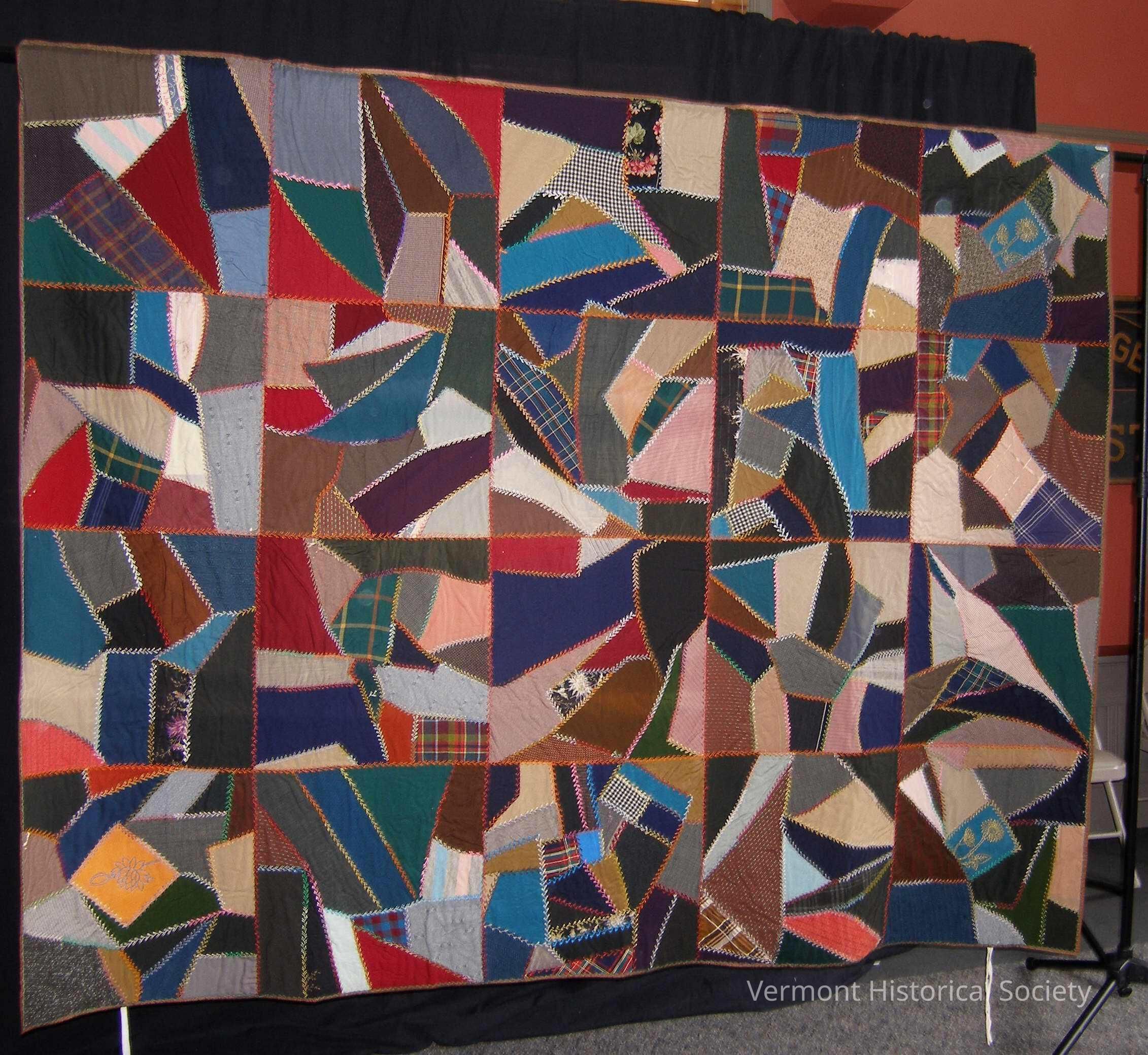 Crazy quilt pieced from several colors and patterns of wool. The piecing seams are decorated with feather stitches. The back is pieced from large pieces, with two strips of crazy piecing. The seams of the back are also decorated with feather stitches. It is tied rather than quilted.Context