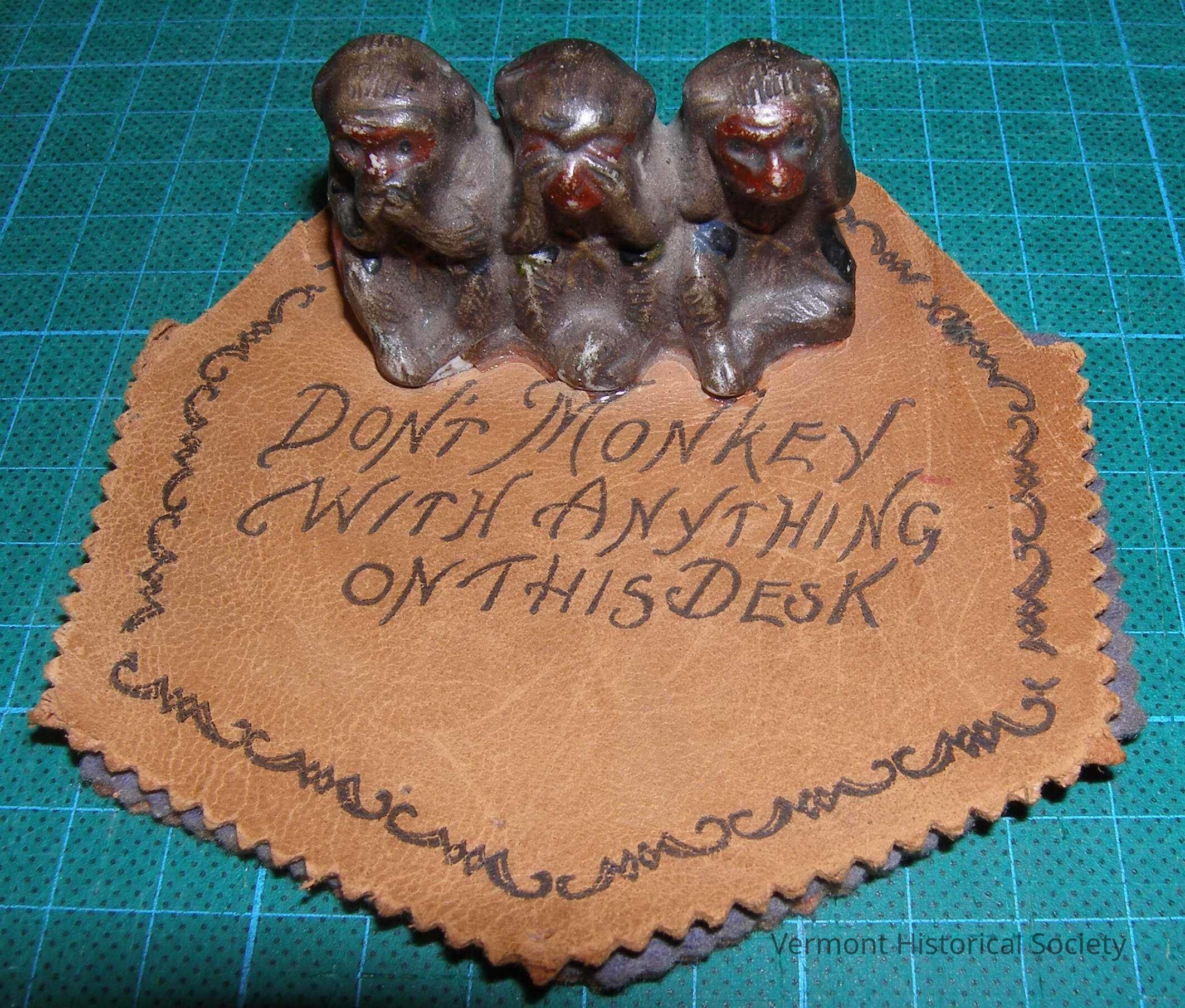 Desk blotter with figure of 3 monkeys glued to top layer. 3 monkeys represent "Speak no evil, see no evil, hear no evil" The first wears a coat of red, the second a coat of green, and the third a coat of blue. Coats are visible only from back. Blotter pad on which they rest is made up of 4 7-sided layers, the bottom being a green blotter which is mostly torn away; the next two layers are blue and red felt, and the top layer is leather, which has a scroll design around border and printed in ink in center: "Don't Monkey/ With Anything/ on This Desk" The layers are pinked around the edges and are stapled together, with the staple being out of sight under the monkeys.Acquisition
