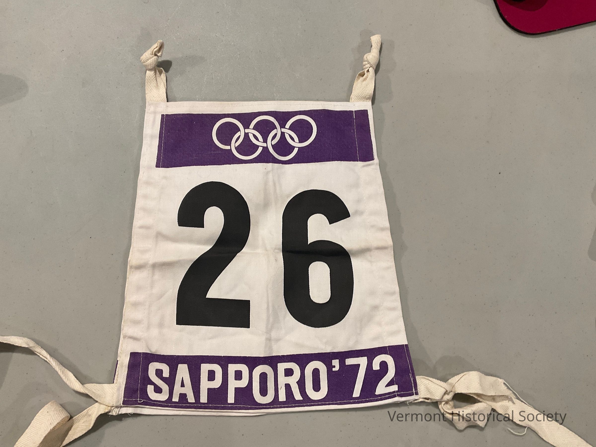White canvas double-sided ski bib. The top of the bib shows white Olympic rings outlined by a purple box. The number, "26" takes up the center area in black. The bottom reads, "SAPPORO '72" in white text and is also outlined by a purple box. The text reads the same on both sides and the cloth panels are held together with cloth ties.Context