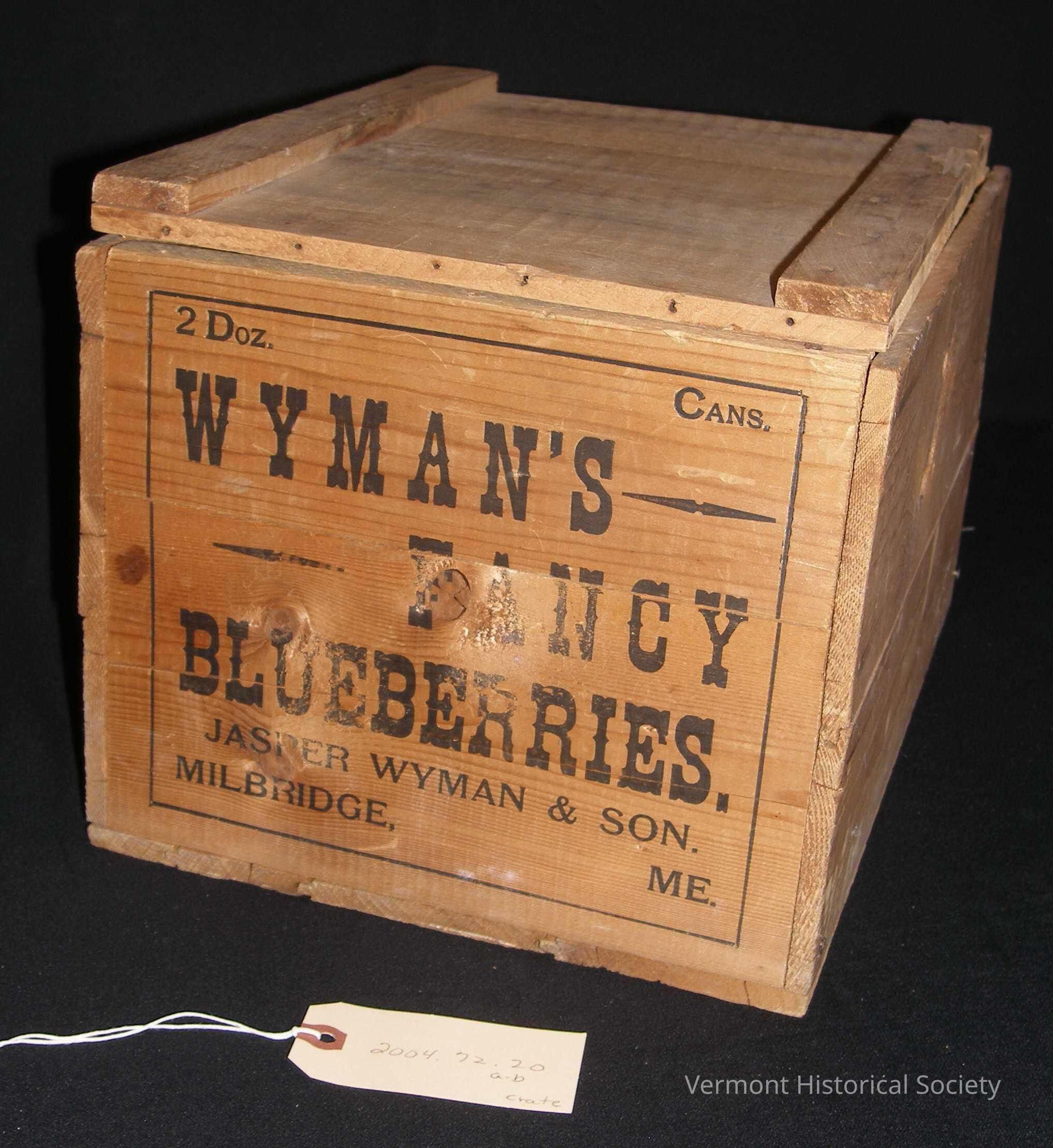 Wooden shipping crate. The top side (lid) is detached. One side is printed with the label, "2 Doz. Cans. WHYMAN'S FANCY BLUEBERRIES. JASPER WYMAN & SON. MILBRIDGE, ME." The opposite side is branded with the inscription, "S JGCO ST. JOHNSBURY VT".Context