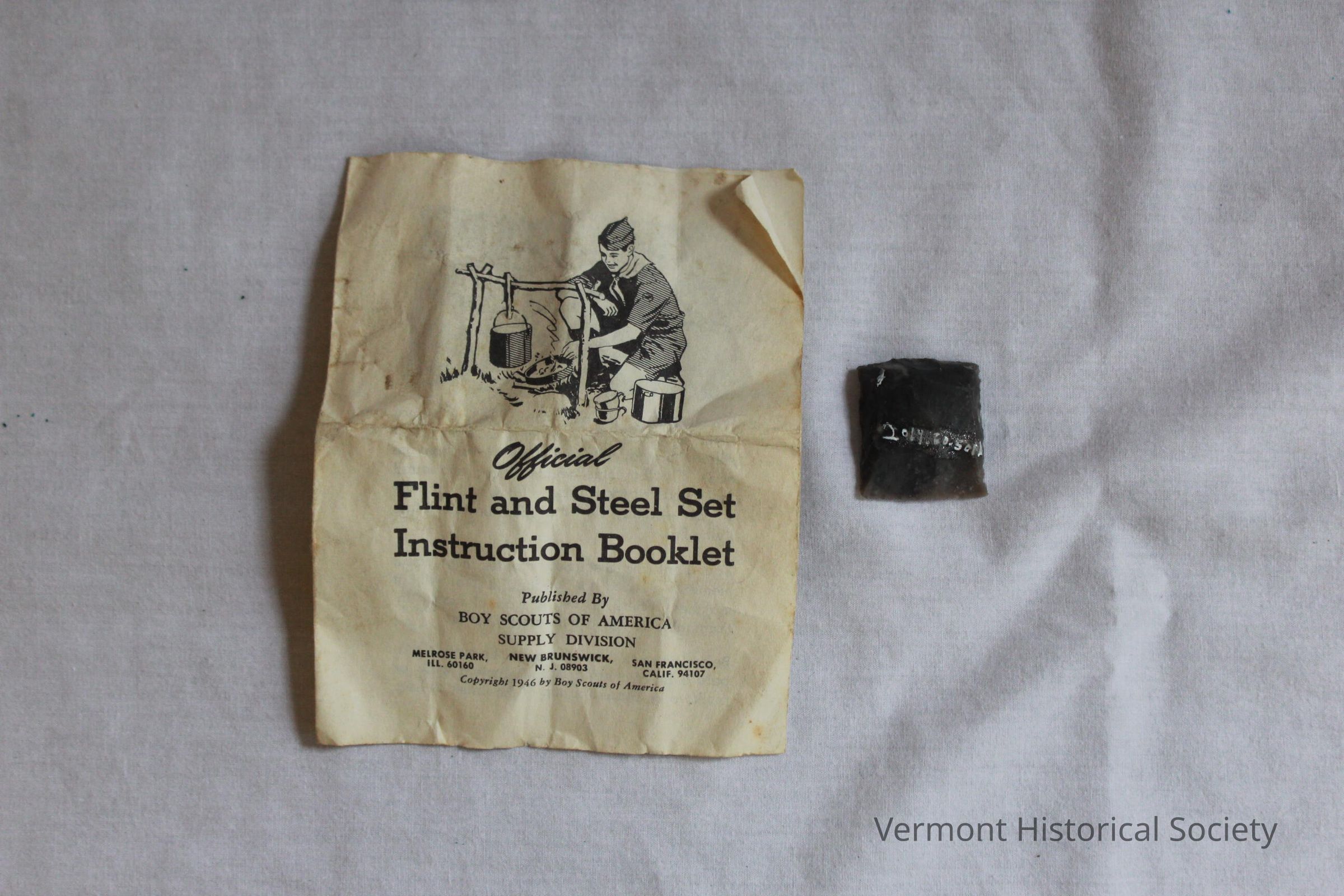 Small, rectangular piece of flint accompanied by an instruction manual. The manual explains how to use the flint to start a fire.