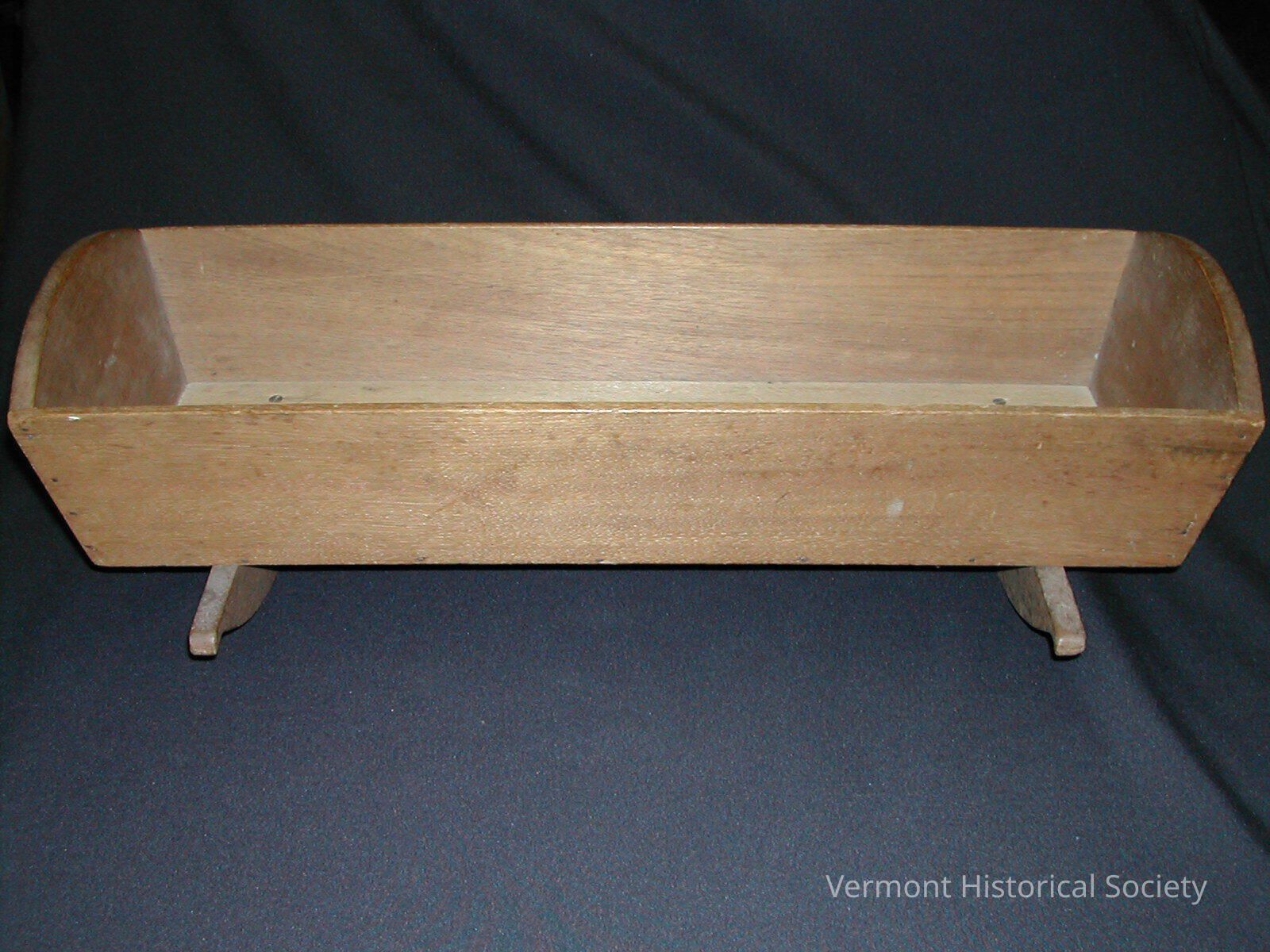 Rectangular doll cradle with flared sides. The cradle sits on two curved rockers placed near each end. The inscription, "BURLINGTON VERMONT / GRACE GOODHUE", is roughly penciled on the bottom in a child's hand.Context