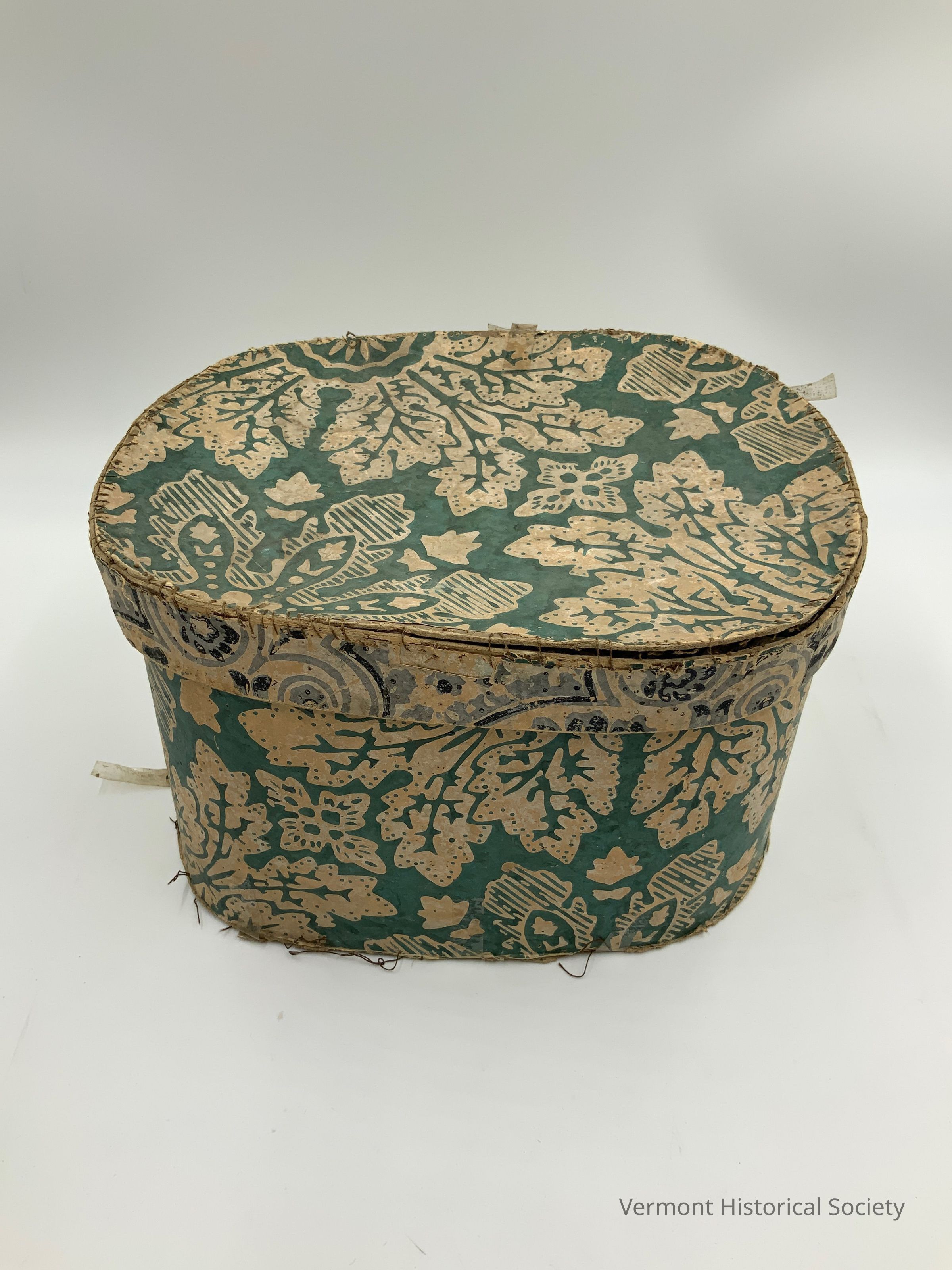 Oval band box with a lid. The exterior of the box is covered in wallpaper. The top of the lid and the body of the box have a teal ground with white leaves and flowers. The lid band has a blue ground with dark blue and white floral swirls. The interior of the box is lined with newspaper.Context