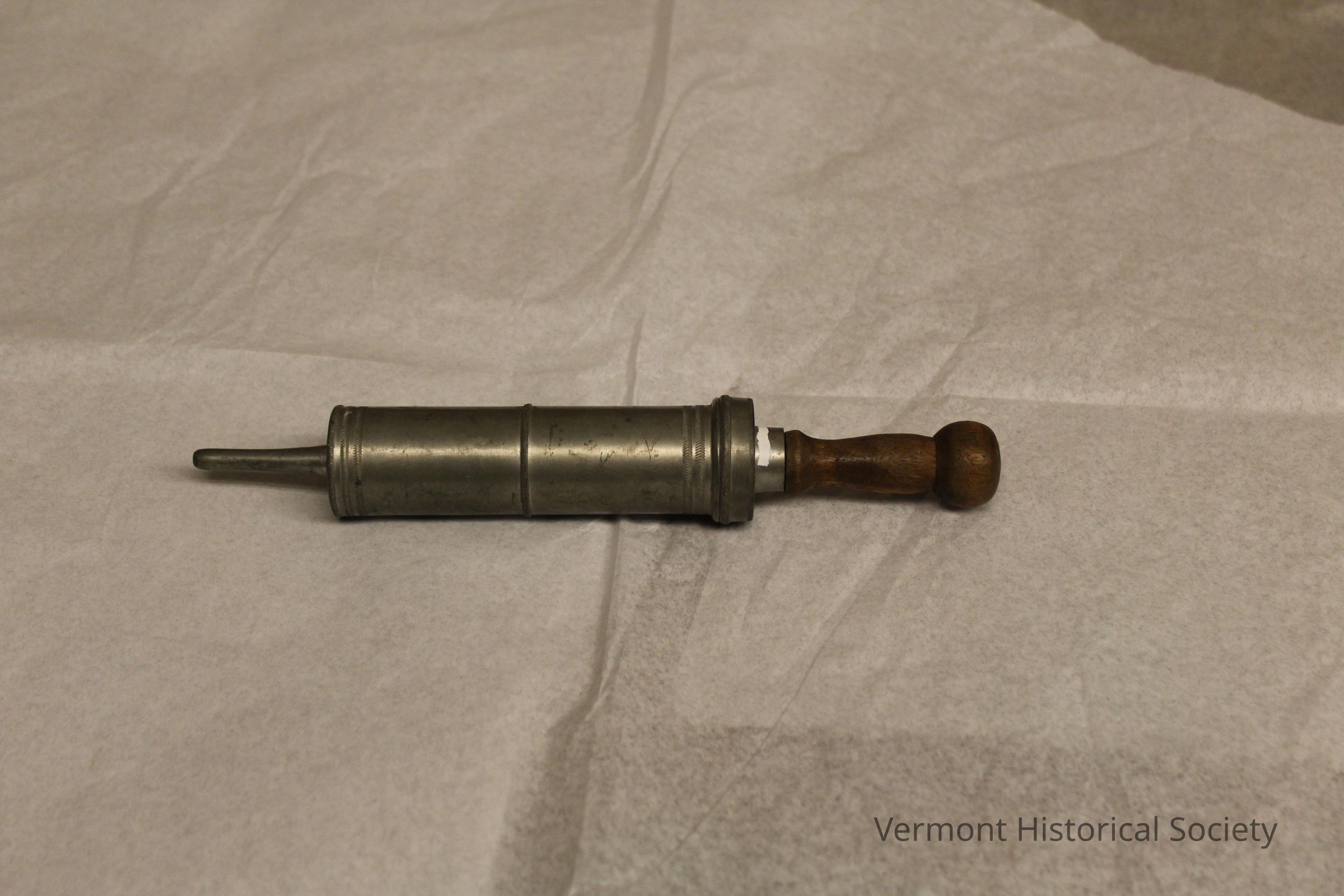 Metal syringe with wooden knob handle. The handle presses a plunger into the body of the syringe.Use