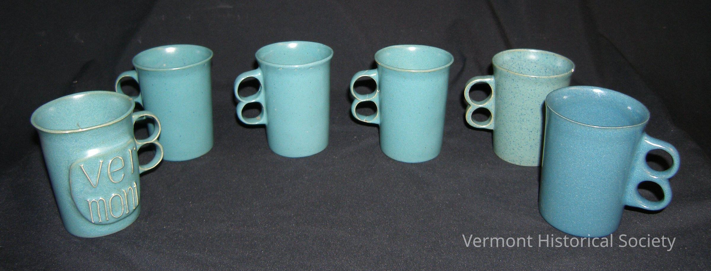 Six blue ceramic coffee mugs with two-finger handles. One of the cups is molded with protruding seal that reads "ver / mont".